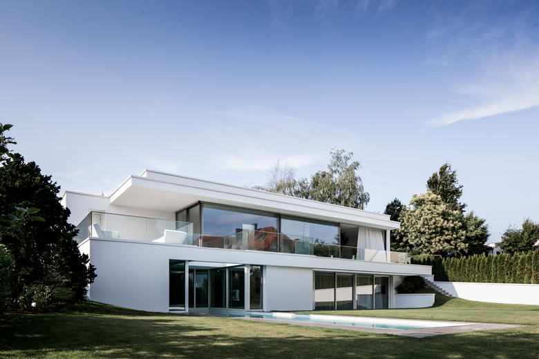 So entstand ein radikales und kompromissloses Spiel zwischen Öffnen und Schließen. Eine konsequente Geschlossenheit zeigt der minimalistische Baukörper zur Straße hin, zu der er sich einzig durch die Haustüre und die Garage öffnet und somit die Privatsphäre der Bauherren schützt und behütet. Offenheit und Transparenz dagegen prägen das Gebäude zum Garten hin, wo eine 18 m lange Highend-Glasfassade den Blick in die Natur und den Pool freigibt.
