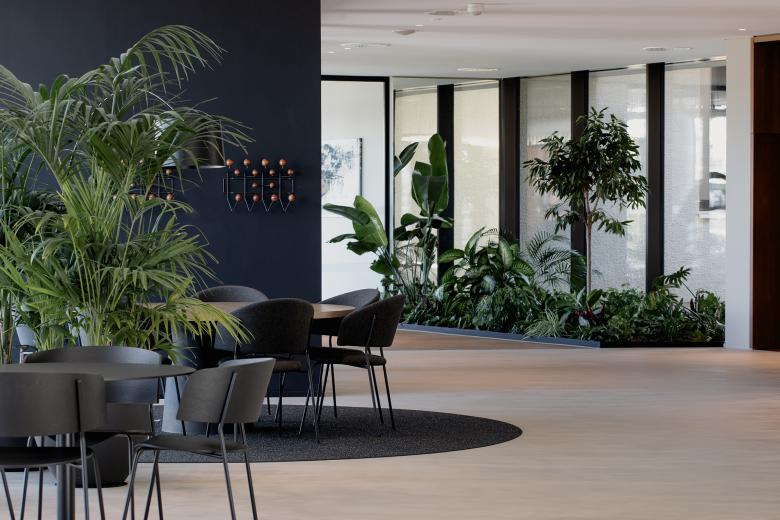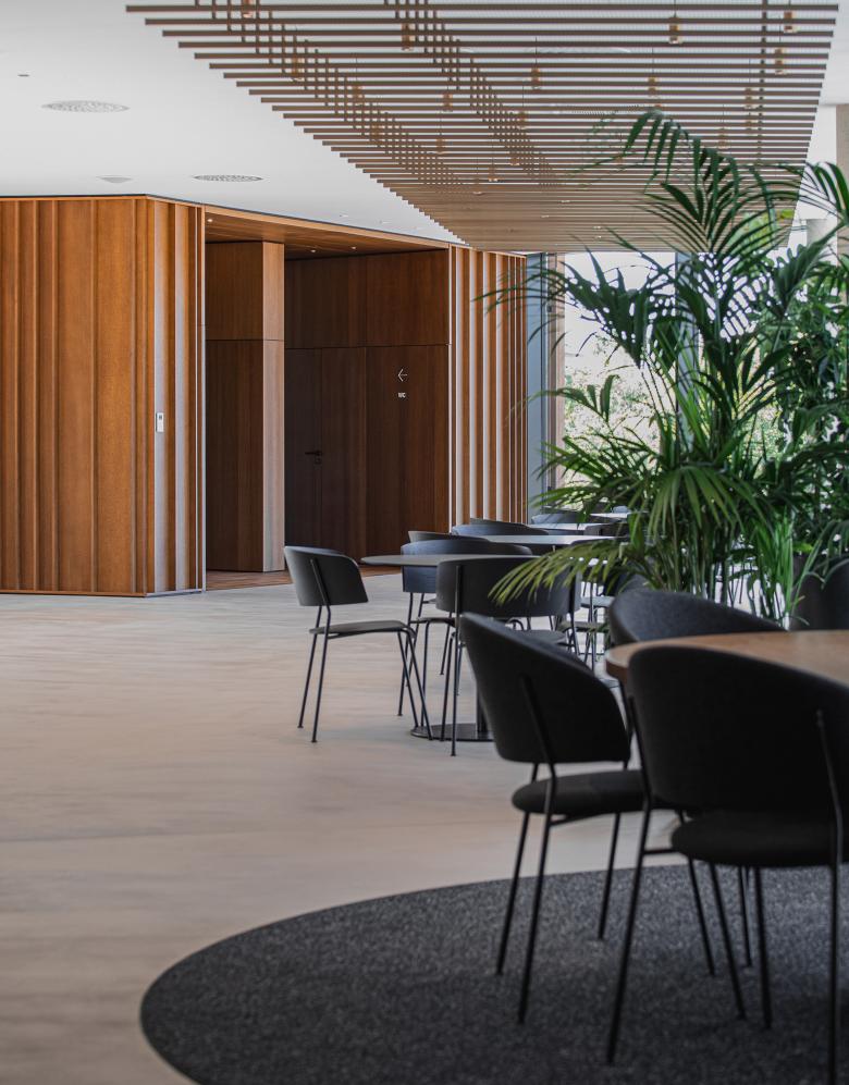 Coming from the street, a large staircase leads visitors and employees to the partly paved, partly planted, spacious plaza, while the floor-to-ceiling black double doors in the otherwise fully glazed façade already open invitingly and offer the first glimpses into the lively foyer. This is where employees of all the companies based at the headquarters and external guests meet in the in-house bistro, taking advantage of the varied, regional food on offer at all times of the day and enjoying the homely ambience at the foot of the vineyards.