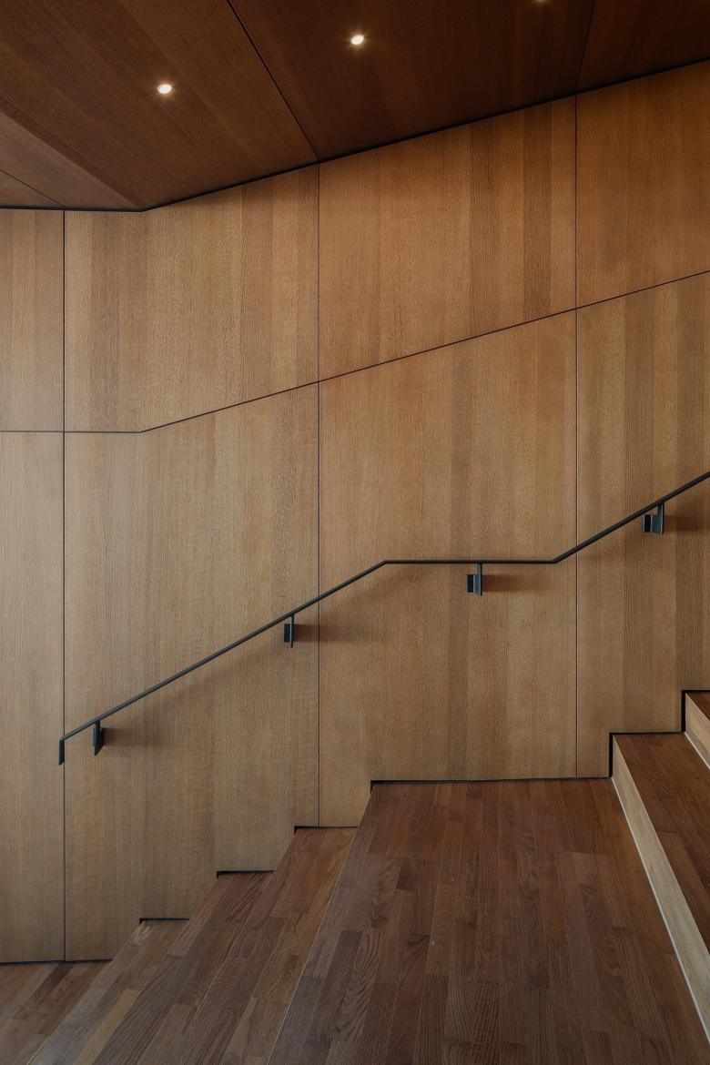 The roofs are also greened and equipped with a photovoltaic system and thus represent, in addition to the surrounding wooden façade, the ecological and sustainable design approach as well as the principles of the company. The vertically arranged wooden slats stretch like a band over all four fingers, creating a varied façade image of closely spaced slats in front of the opaque components and a loosened arrangement in front of the floor-to-ceiling windows and fixed glazing. In addition to the natural wooden façade, the base of the building and the top floor of the main wing - the company headquarters of XEPTUM Consulting AG - are finished in white plaster.