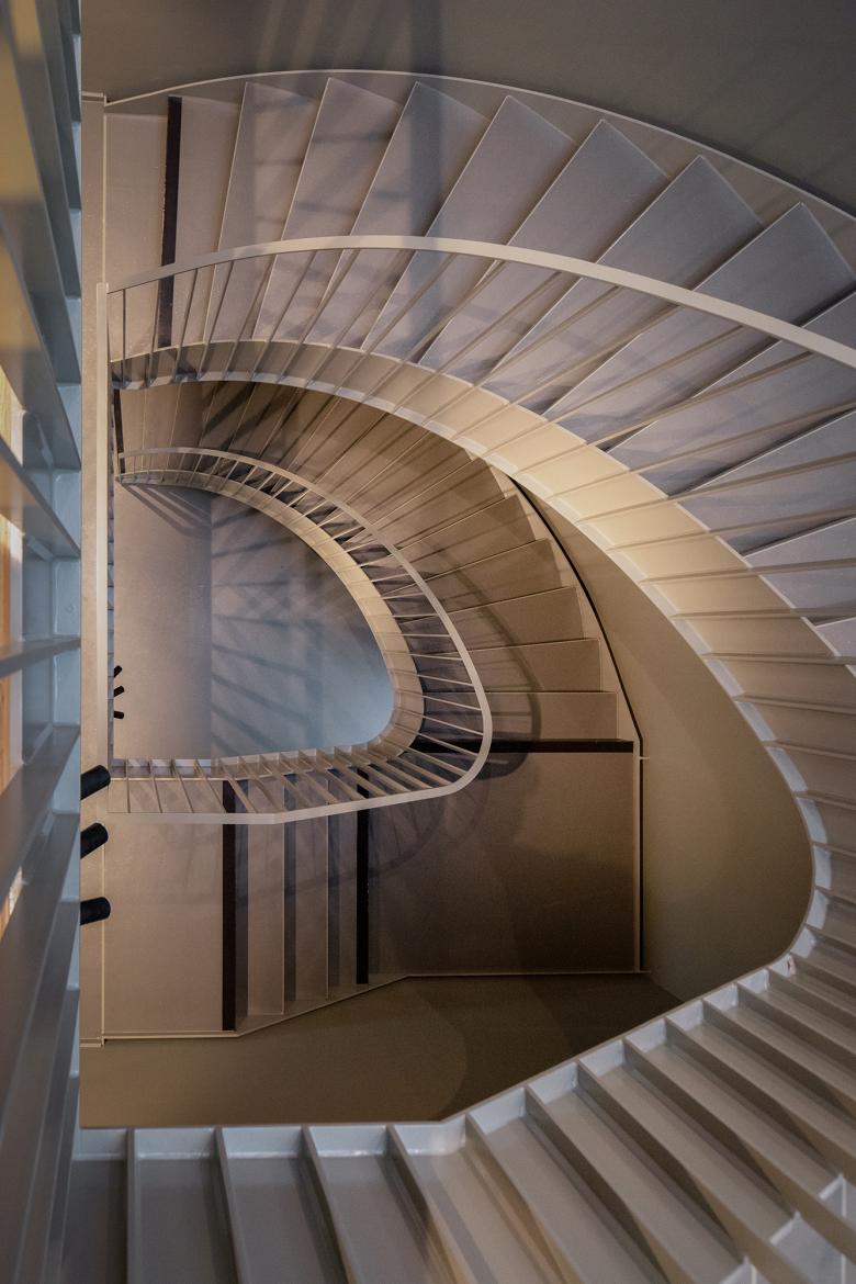 A large interior planting bed marks the transition to the building part of XEPTUM Consulting AG, the entrances to the four fingers themselves are defined by wood-panelled portals, which sometimes lead at ground level and sometimes via wooden steps to the respective company wings. Each wing is self-sufficient and connected to the communal underground car park via staircases painted golden green. The other ancillary rooms - such as wet rooms and cloakroom areas - were also designed to be architecturally and colourfully appealing. In addition to various shades of green, a dark blue - XEPTUM's corporate colour - repeatedly appears in the interiors. Various natural but also coloured woods together with black and white tiles and red eye-catching furniture round off the potpourri. The highlight of the three-storey wing of XEPTUM Consulting AG is the semi-circular curved steel staircase painted green, which winds upwards in the stairwell of the same colour and is covered and naturally lit by a huge dome light.