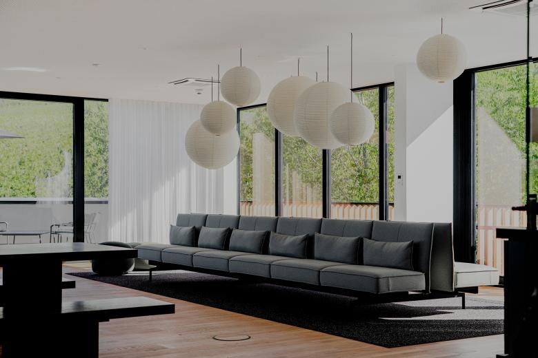 "New Work" is a top priority at the new headquarters, and so special attention was paid to the interior fittings and design: Spaciously designed group and open-plan offices are complemented by smaller office units and individual offices for the executive suite and the accounting department. Numerous meeting zones and flexible team areas complement the diverse room programme and offer employees countless possibilities for working depending on the situation: From the telephone booth as an absolute, noiseless retreat, to the Alcove Highback Work chair developed for Vitra as a single-work station in the large room, to so-called face-to-face rooms that can be separated in a circle with a curtain, the headquarters has a lot to offer in addition to classic conference rooms. Floor coverings and individual fixtures made of wood, together with various textile elements in the form of curtains, carpets and room dividers, create a homely atmosphere. The view of the unique backdrop of the vineyards is omnipresent.