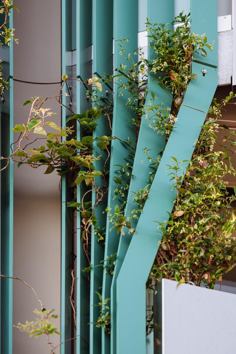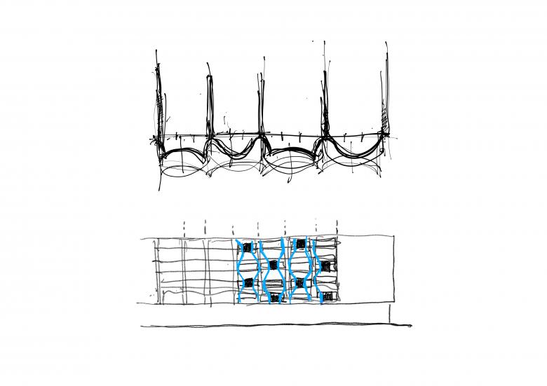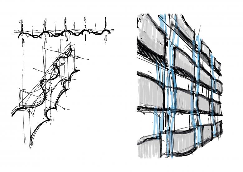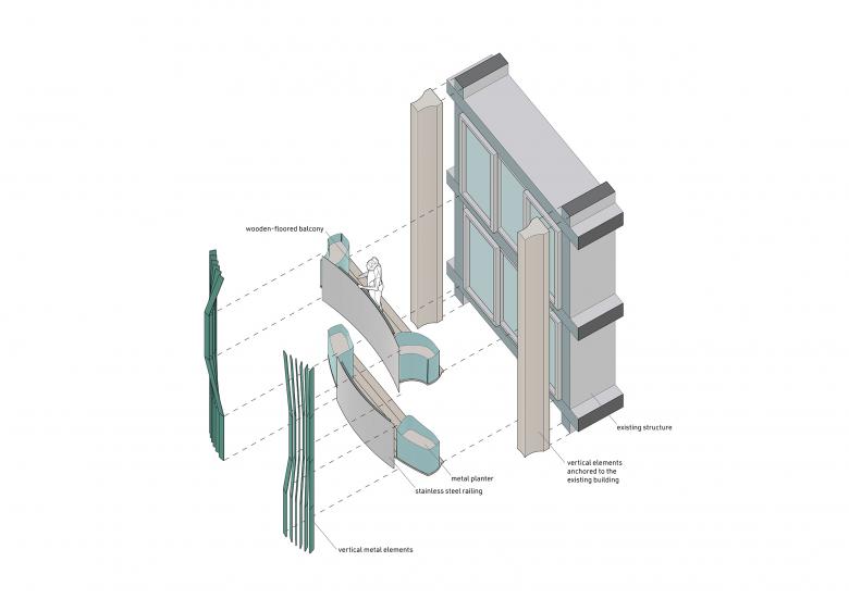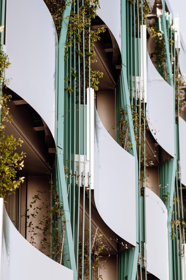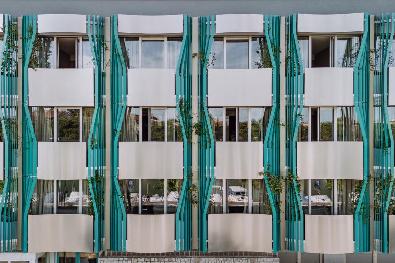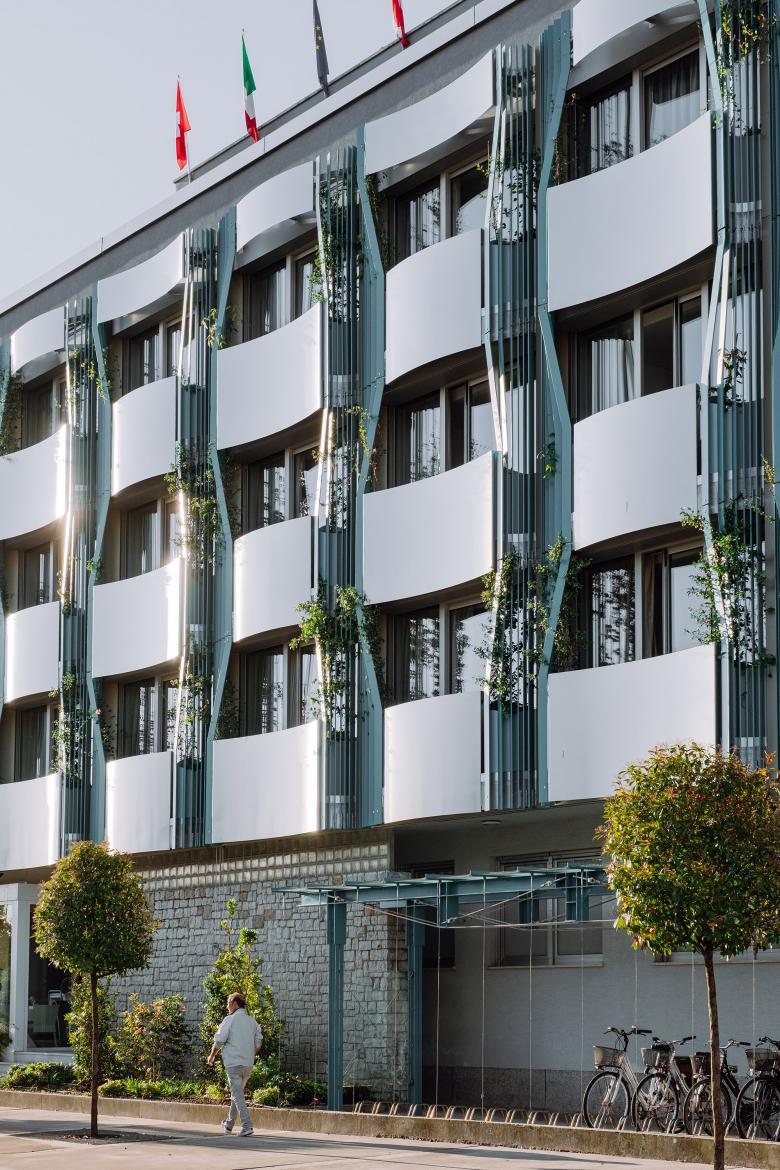 The new north and west facades of the existing building act as thresholds between inside and outside, protecting from noise and rush while simultaneously improving acoustic, thermal, and aesthetic qualities as well as the overall cityscape. Sweeping balconies with convex and concave segments are the central design element: they generate a dynamic, relief-like facade, constantly shifting in the interplay of light and shadow. These outdoor spaces also serve as bioclimatic buffers with greenery, visual screening, and integrated rainwater management - enhancing the interior climate, avoiding urban heat islands, and emphasizing sustainable principles.