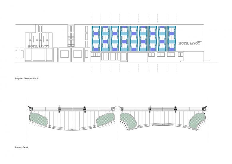 The street-facing facades of Hotel Savoy are being transformed into a rhythmic, green structure of curved steel. This new outer layer creates private outdoor spaces while filtering light, noise, and views. In doing so, the hotel becomes more deeply integrated into the urban context, and the architecture emerges as a breathing threshold between city, landscape, and hospitality.