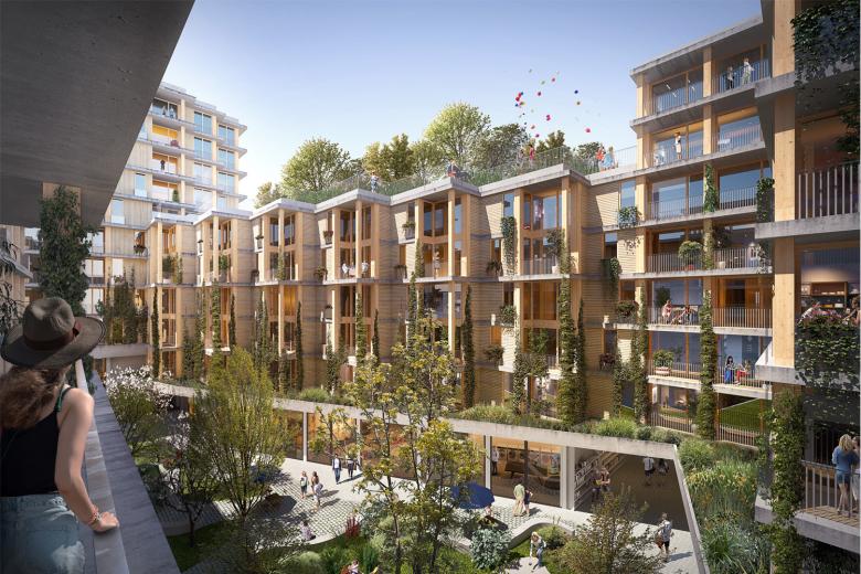 Das Projekt schafft eine bewusste Differenzierung und Schichtung des Gebäudevolumens durch die konstruktiv und formal unterschiedliche Ausbildung des Gebäudesockels und den darüber liegenden Geschossen. Das Gebäudeensemble wird dialektisch mit massivem Gebäudesockel und darauf aufgesetzten, im Modulraster angeordneten „leichten“ Wohngeschossen konzipiert. Ein umlaufender Sockelvorsprung ermöglicht die üppige Begrünung der Gebäudefassaden und akzentuiert die Schnittstelle zwischen Sockel und den darüber liegenden Geschossen.