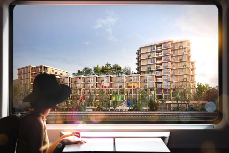 Die städtebauliche Konfiguration der Gebäude folgt dem zu Grunde liegenden städtebaulichen Masterplan und modelliert das Volumen. Drei Bauteile (Bauteil 1+2+3) formen eine zusammenhängende geschlossene Bebauung und damit einen geschlossenen Rücken zur Bahn. Der Bauteil 1 wird als sichtbarer und markanter Hochpunkt im Süden des Bauplatzes in Szene gesetzt. Der Bauteil 2 schöpft die mögliche Gebäudehöhe von 25m nicht aus. Dadurch werden die Prägnanz des südlichen Hochpunktes und der Gebäudesilhouette verstärkt. Zugleich wird durch die reduzierte Bauhöhe eine angenehme räumliche Proportionierung und Belichtungssituation im binnenräumlichen Innenhof geschaffen. Der Bauteil 3 im Norden wird mit einer Gebäudehöhe von 25m konzipiert und schließt die Silhouette zur Bahn als moderater zweiter Hochpunkt ab. Der Bauteil 4 ist als solitärer Baukörper entlang zur Landgutgasse geplant bildet eine urbane Front zum öffentlichen Gut.