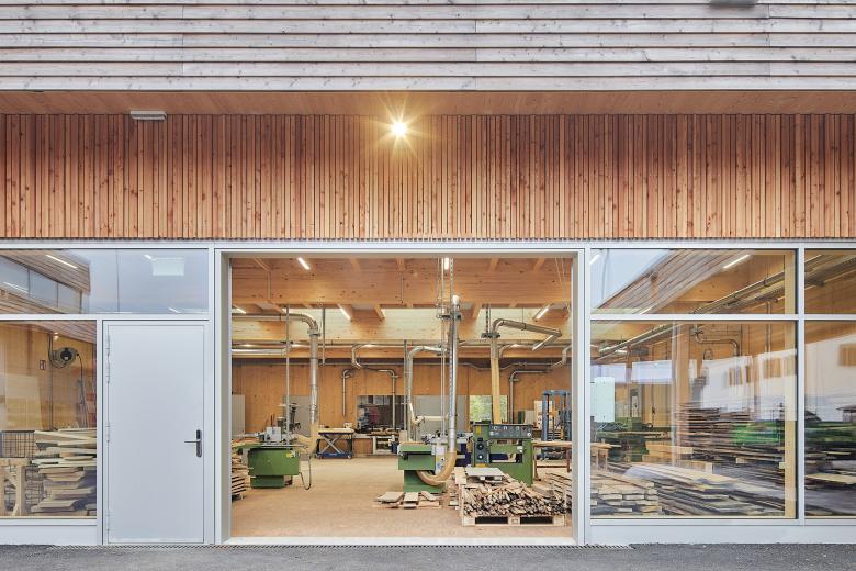 Die Werkstätten für Holztechnik, Metalltechnik und Landtechnik gruppieren sich L-förmig um einen gemeinsamen Werkhof. Der Werkhof dient als Manipulationsfläche und als gemeinsamer Arbeitsbereich im Freien. Im Norden wird der Werkhof durch eine Wand vom Reitplatz abgetrennt. Dadurch werden störende Sicht- und Schallimmission zwischen beiden Funktionsbereichen vermieden. Die Dimensionierung des Werkhofes ist so gewählt, dass die Ein- und Ausfahrt zur Anlieferung mittels LKW in einem Zug möglich ist. Die Anlieferung in die Werkstätten erfolgt über Sektionaltore vom Werkhof. Die Produktionshalle der Metalltechnik steht in direktem Bezug zum Arbeitsbereich der Landtechnik.