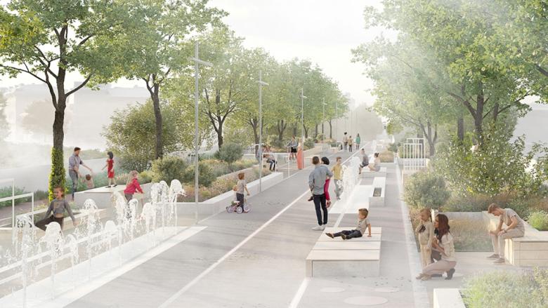Das Konzept schützt und vergrößert den bestehenden Baumbestand, indem zusätzliche Bäume gepflanzt werden. Die historische Allee auf der Hohenbergstraße wird auf der Bücke weitergeführt. Die grüne Brückenallee verknüpft die beiden Stadtteile, indem die bestehenden Grünflächen zusammengeschaltet werden. Die Parks an den beiden Seiten binden die Brücke städtebaulich ein. »Unterm Kronendach« am Schedifkaplatz bietet eine multifunktionale Begegnungsstätte mit natürlicher Beschattung. An der Hohenbergstraße verbessert der »Wasserpark« mit Liegewiese und Wasserbiotop das Mikroklima und bietet Erholung. Klimafeste Baumarten und Stauden verbessern das Mikroklima und fördern die Biodiversität. Prinzipien der Kreislaufwirtschaft werden durch Wiederverwendung von Bodenaushub und Holzmaterial berücksichtigt.