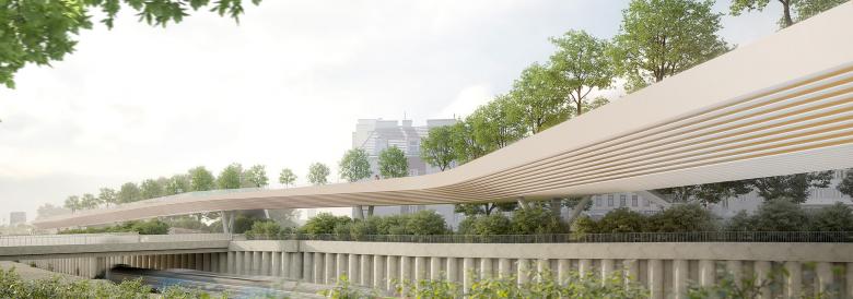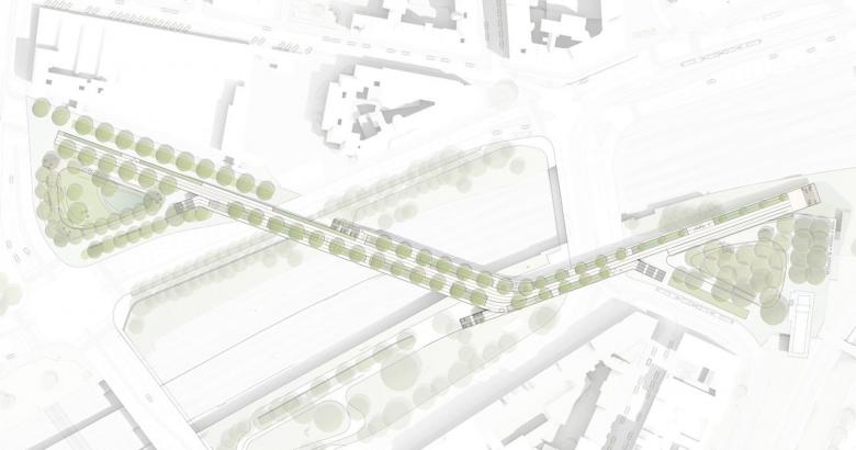 »Das Projekt reagiert auf die bestehende städtebauliche Situation auf eine selbstbewusste Art und Weise und verbindet die sehr differenzierten Stadträume durch eine klar strukturierte Brücke. Die aus zwei geradlinig verlaufenden Brückenteilen bestehende, promenadenartige Konstruktion reagiert in ihrer Breitenentwicklung unterschiedlich auf die jeweiligen räumlichen Situationen des Weges.« (Statement des Preisgerichts)