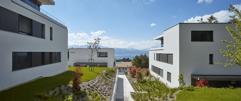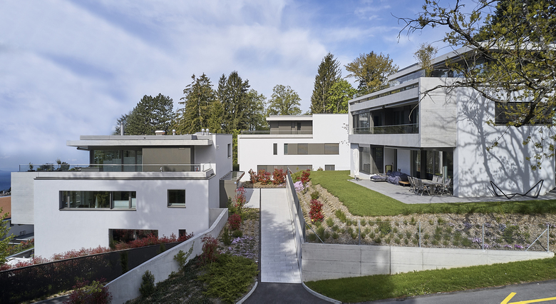 Cet ensemble, localisé en zone villa à Pully, se compose de trois villas urbaines comprenant chacune trois appartements, un par étage. Les appartements type de 184 m2 comptent 5½ pièces dans la solution de base, avec 4 chambres dont un bureau pouvant être relié au salon. Les surfaces extérieures varient de 25 m2 pour les loggias des étages, à 70 m2 pour les terrasses du rez-de-chaussée – sans compter le jardin qui les entoure. Pour les appartements d’attique, le programme de base propose un 3½ pièces de 104 m2, avec deux chambres en suite et un espace jour ouvert sur une terrasse de 100 m2. Grâce au plan rayonnant, tous les espaces s’ouvrent discrètement sur le contexte et clairement sur le grand paysage et le Lac. Les trois bâtiments sont reliés en sous-sol par un parking de 18 places qui, avec sa spatialité généreuse mise en valeur par l’apport de lumière naturelle, contribue à la qualité de l’ensemble. L’espace de transition entre le parking et les appartements intègre le programme des caves et des locaux techniques.