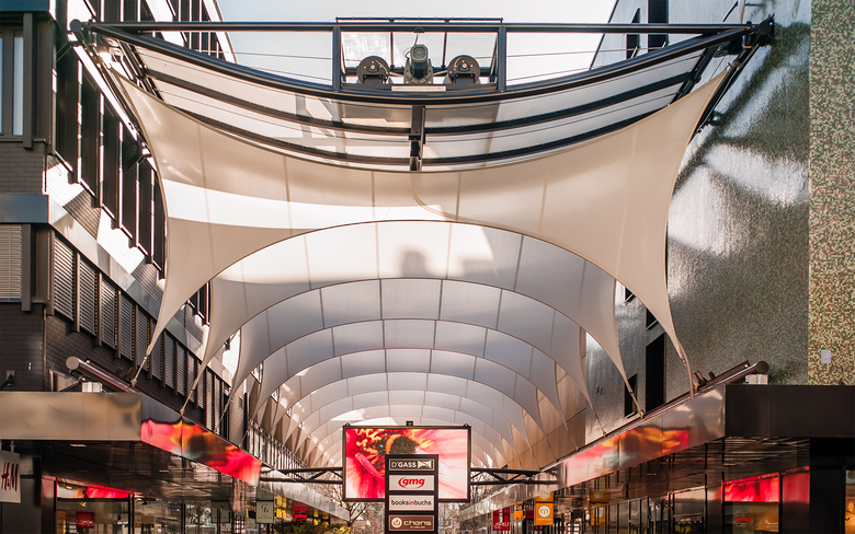 Das faltbare Membrandach erstreckt sich über eine 50m lange Gasse im Herzen der Stadt Buchs, Schweiz. Im aufgespannten Zustand nimmt die Dachhaut eine sehr räumliche, wellenförmige Geometrie ein. Das textile Gewebe ist zwischen bogenförmige Grat- und Kehlgurte gespannt und bildet so eine Abfolge dynamischer Elemente mit einer mittleren Höhe von 6,50m über dem Straßenniveau. Die zusammengefaltete Membrane wird am nördlichen Ende unter einem Schutzdach geparkt, das zwischen den Gebäuden ein Tor zur Metzgergasse bildet. Während des Auffahrens wird die Membrane gleichzeitig auch in Querrichtung gegen Windlasten räumlich vorgespannt. Die maßgebenden Windlasten für die Dachkonstruktion wurden durch Versuche im Windkanal speziell ermittelt. Die Membrane wurde aus einem PTFE-Gewebe konfektioniert, das optisch und qualitativ höchsten Anforderungen entspricht.
