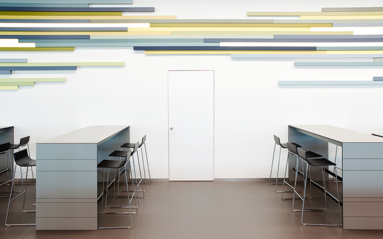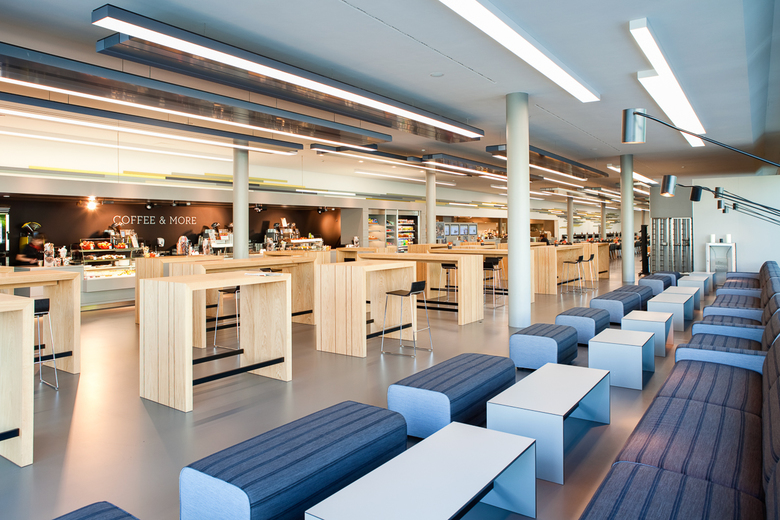 Das Konzept greift mit modernen langen Tischen die traditionelle „grosse Tafel“ auf, die die gemeinsame Mahlzeit fördert. In der Cafézone, die in Steh- und Loungebereich gegliedert ist, klingt in entspannter Atmosphäre die Mittagspause aus. Das grosse Raumvolumen wird durch die gestaffelte Farbnuancierung der Decken- und Wandelemente zoniert.