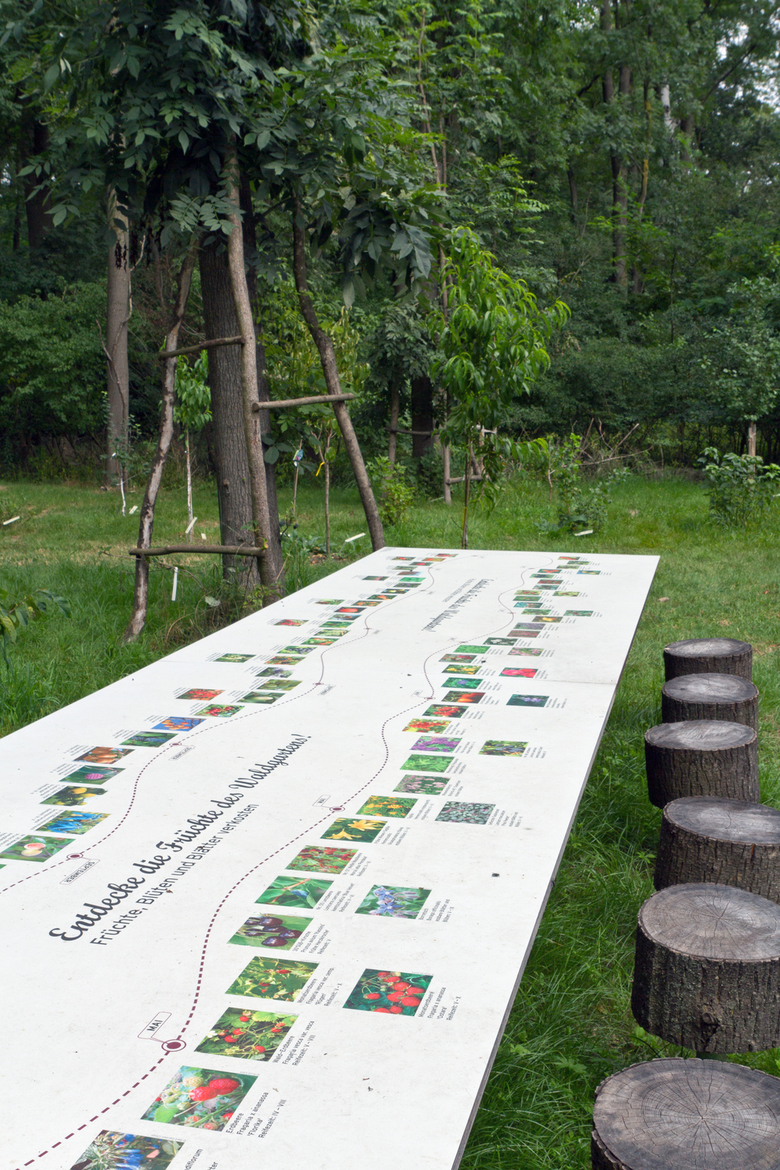 Der Waldgarten ist ein neu kreierter Freiraumtyp, orientiert sich an dem schichtenartigen Aufbau von lichten Wäldern und verbindet Vorzüge des „Gartens“ mit Eigenschaften des „Waldes“. Die Gestaltung mit sortenreichen Obst- und Nutzgehölzen unter anderem Raritäten wie Indianerbanane, Chinesische Dattel und Wollmispel, mit essbaren Kletterpflanzen und ein Vielfalt an Beeren wie Goji-, Lenz- und Taybeeren machen den Freiraum reichhaltig. Es wird eine Vielfalt an Kulturpflanzen gezeigt, die aufgrund von robusten Züchtungen und optimaler Standortwahl auch in unseren Breiten gedeihen. Diese Sorten werden durch den Klimawandel möglicherweise in Zukunft noch stärker an Bedeutung gewinnen.