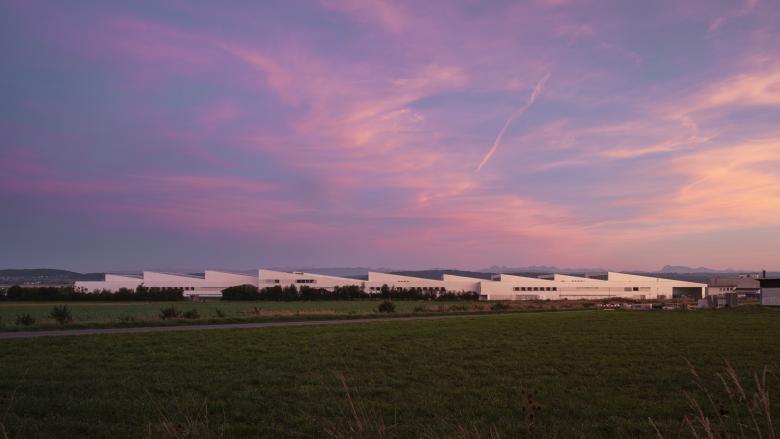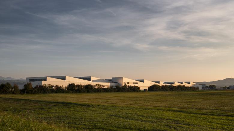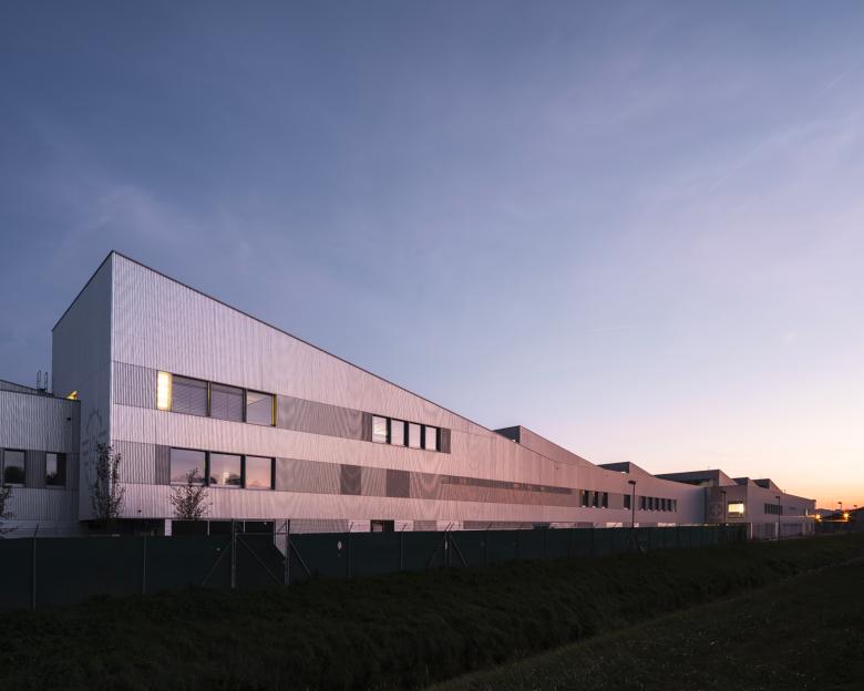 L’expression en façade cherche à renforcer la force de la forme par le choix d’un matériau industriel et durable, un bardage en aluminium naturel, monochromatique, dont les variations sont issues d’un travail sur la texture de la tôle : trapézoïdale ou plane, pleine, perforée, ou semi-perforée. Ces variations permettent de répondre aux situations et nécessités variées de la façade : transparence, protection, accès, et ventilation. La cinquième façade, la toiture qui représente une surface considérable, accueille près de 2’990 panneaux solaires photovoltaïques.