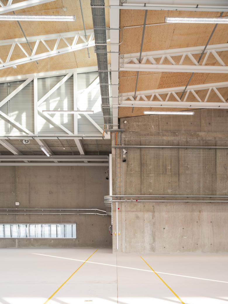 La coupe, dictée par l’usage, s’adapte aux besoins dimensionnels variés des halles, la structure pouvant atteindre jusqu’à 38m de portée. L’emploi de sheds, forme industrielle typique, amène la lumière naturelle aux utilisateurs et s’adapte aux variations des portées structurelles.