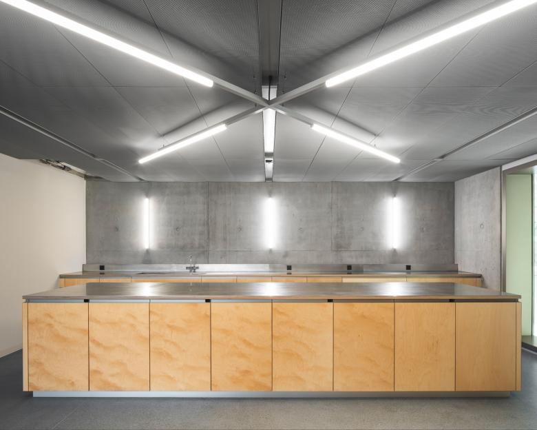 L’ensemble du projet reprend cette palette de matériaux pour la décliner en plafonds, murs, sols et menuiseries, la règle étant, à l’instar de la façade, de varier les traitements d’un même matériau (perforations, anodisation, expression brute, etc.).