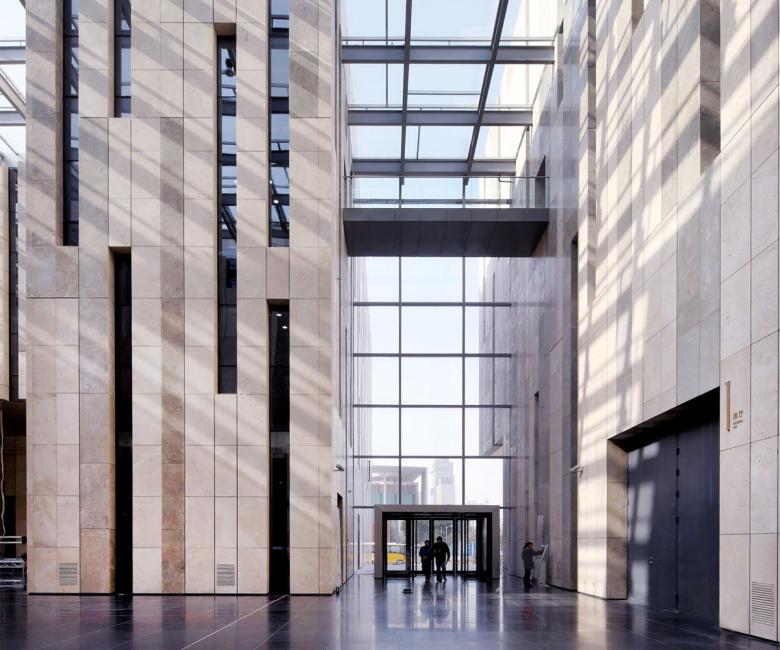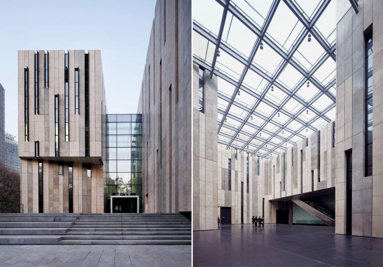 Im kulturellen Zentrum Nanjings gelegen, zählt das neue Jiangsu Provincial Art Museum zu einem der bedeutendsten Ausstellungshäuser im Südosten Chinas. Die beiden ineinander verschränkten Baukörper formen einen Zwischenraum, der als Eingangshalle öffentlich zugänglich ist und zwischen aufstrebenden Natursteinwänden lediglich von oben belichtet wird. Die weitgehend geschlossene Travertin-Natursteinfassade mit schmalen, vertikalen Fenstereinschnitten betont den monolithischen Gesamteindruck des Ausstellungsgebäudes.