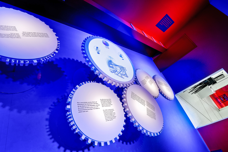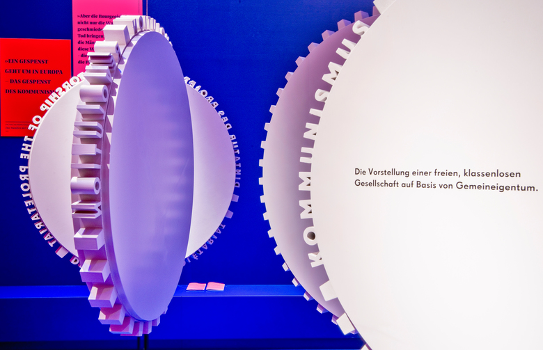 Die Landesausstellung im Rheinischen Landesmuseum Trier nimmt anlässlich des 200. Geburtstages von Karl Marx sein gegenwärtig wieder hochaktuelles Lebenswerk in den Blick. Der gestalterischen Idee folgend, entwickelt sich das Zahnrad von dreidimensionalen Begriffszahnrädern bzw. Gedankenzahnrädern innerhalb der Ausstellung zu einer komplexen Gedanken- bzw. Marx-Maschine. Die anspruchsvollen theoretischen Inhalte werden in drei Denkräumen, die seine drei Hauptwerke vertiefen, neben klassischen Begriffserklärungen per Text zusätzlich bildlich über Projektionen mit erläuternden Comics auf den Zahnrädern vermittelt.