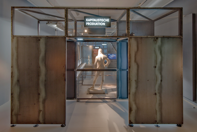 Der konzeptionellen Idee der Denkräume folgend, werden die Überlegungen von Marx in Form einer Maschine dargestellt, die auf Grund ihrer Komplexität und Größe das gesamte Raumbild prägt. Förderbänder transportieren Marx´ Ausführungen zur kapitalistischen Produktion durch den gesamten Raum und bilden in abstrahierter Form zugleich deren Zusammenhänge ab.