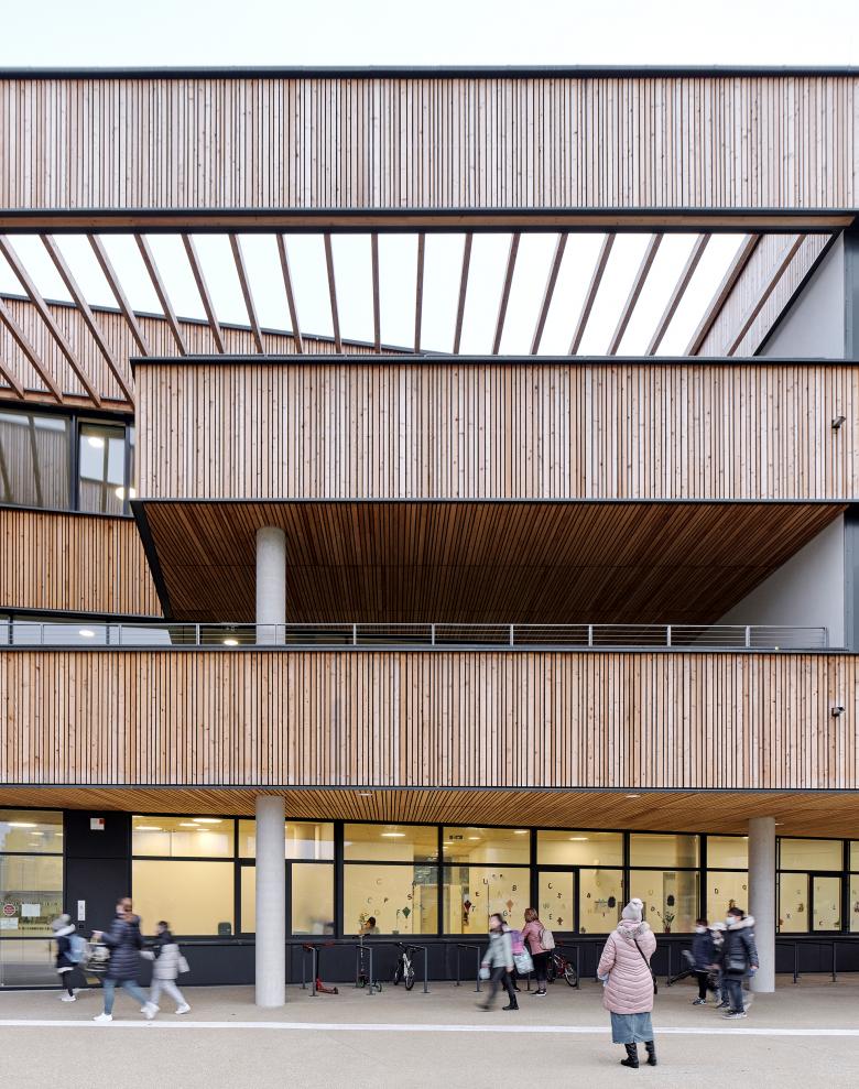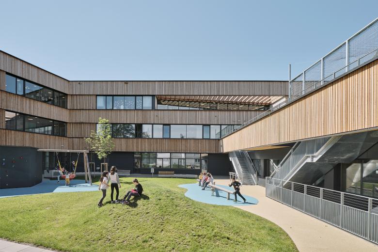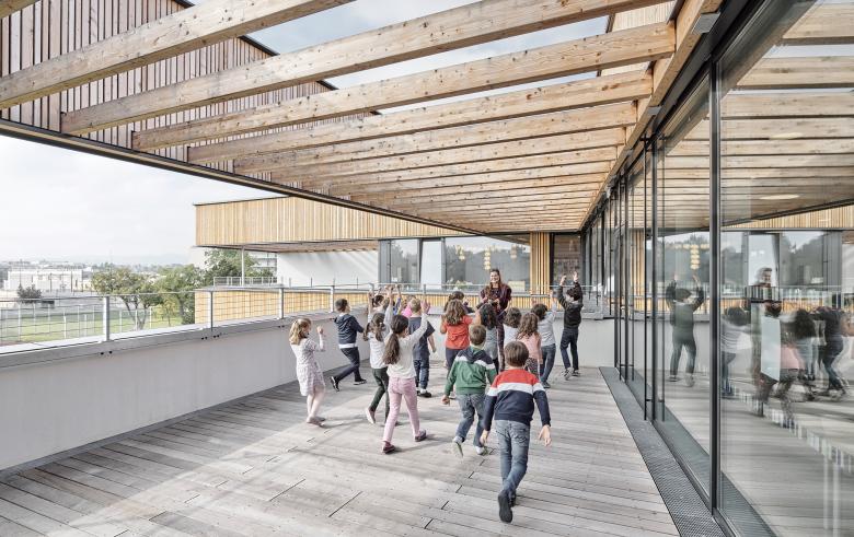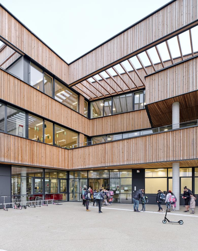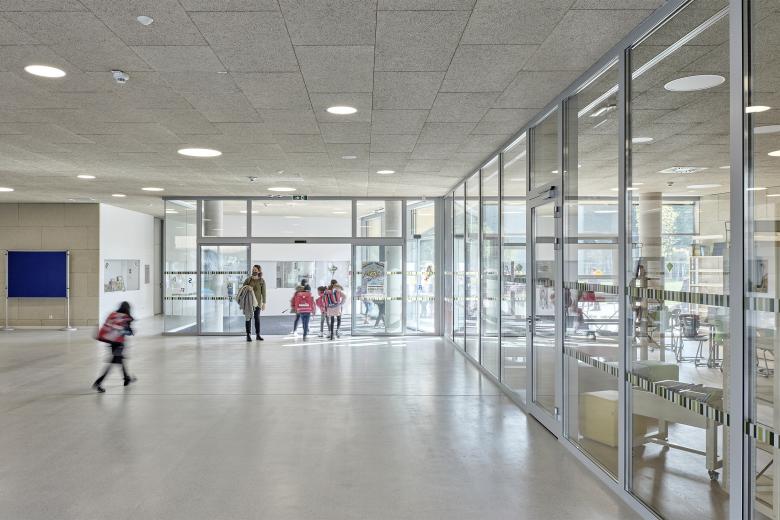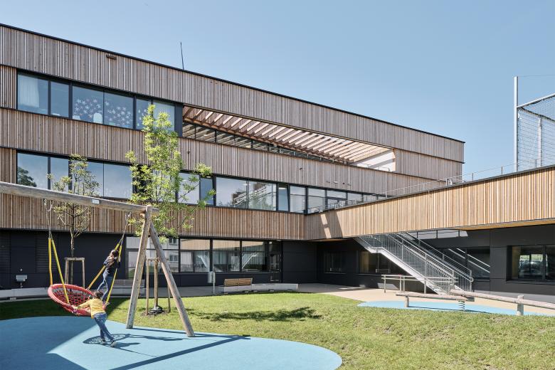 In den beiden Obergeschossen sind jeweils zwei Cluster untergebracht, die von der großzügigen Erschließungszone aus betreten werden. Die Bildungsräume sind an drei Seiten um die Multifunktionsfläche (MuFu) angeordnet, die als erweiterte Lernzone und "Marktplatz" fungiert. Diese öffnet sich großzügig verglast nach außen. Eine vorgelagerte Terrasse fungiert als Freiklasse - die MuFu und die Terrasse bilden so eine große, gemeinsam nutzbare Fläche.