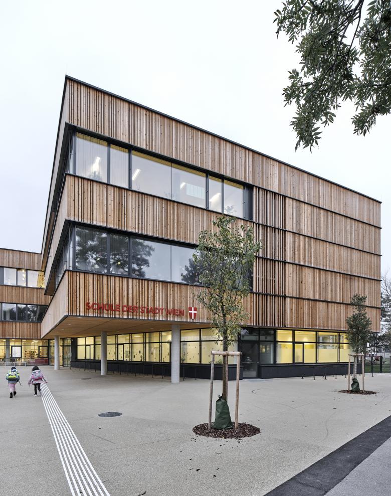 Ein adaptives Lernband – Die neue Volksschule Erlaaer Schleife 2 befindet sich an der Schnittstelle zwischen verschiedenen Stadträumen. Präzise ausgerichtet, vermittelt sie zwischen den benachbarten Bebauungen und bildet so einerseits den Abschluss der bestehenden Bildungsbauten entlang der U6 Trasse als auch den Auftakt zum neuen Stadterweiterungsgebiet In der Wiesen Ost. Die Schule ist als mehrfach geknicktes, adaptives Band konzipiert, das durch seine Knickung Freiräume mit unterschiedlichen Qualitäten erzeugt.