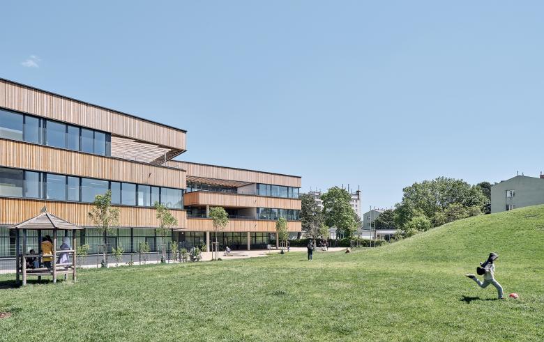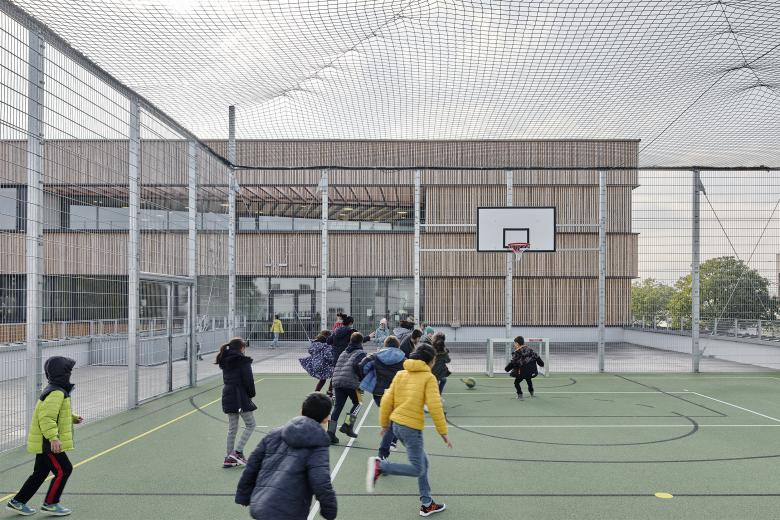 Die Idee eines großzügigen, gefassten zentralen Freiraumes, der beiden Schulen zu Verfügung steht, bildet einen Grundgedanken des Entwurfsansatzes. Die Anhebung eines Teiles des Freiraumes auf das Dach des Turnsaaltraktes ermöglicht eine Fassung und sinnvolle Abgrenzung zum dahinterliegenden Parkplatz und U-Bahndamm. Der Speisesaal mit seiner Südterrasse und die Werkräume mit dem Werkhof erhalten direkte Außenverbindungen.