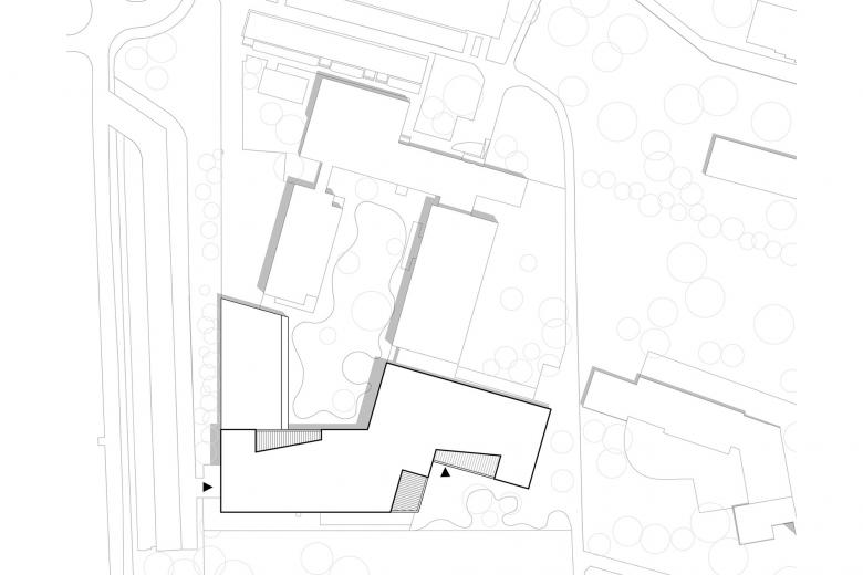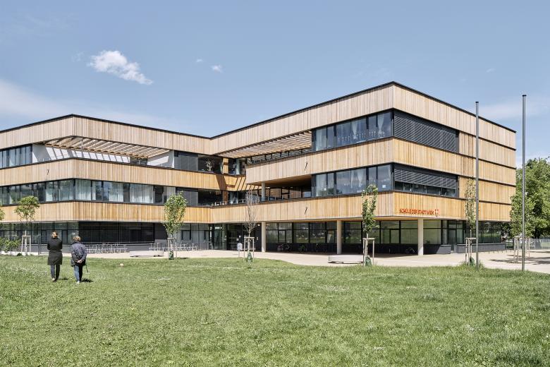 Der östliche Flügel der Schule richtet sich am Bestandsbau und an den angrenzenden Wohnbauriegeln aus. Durch das Anrücken dieses Flügels an die Bestandsschule wird einerseits eine effiziente Verbindung zwischen den beiden Schulen möglich, andererseits entsteht so ein großzügiger Vorplatz, der sich zum südlich gelegenen Park öffnet. Das Schulgelände wird über den zum Park hin offenen Vorplatz betreten. Die großzügige Aula verbindet als fließender Raum alle gemeinsamen Funktionen wie Essen, Bibliothek, Mehrzwecksaal und Werken.