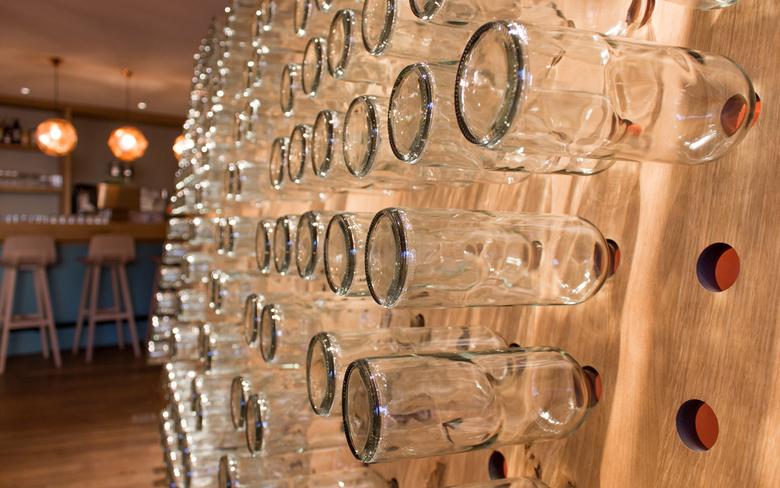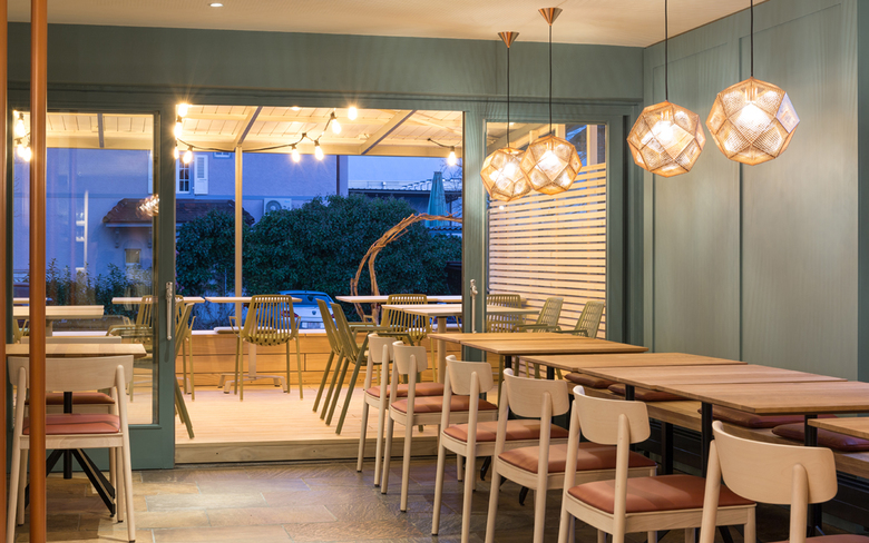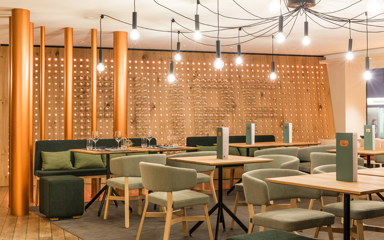 Das Getränkebuffet nutzt den vorhandenen Raum und wird gleichzeitig zum langen Tisch für die Gäste. Kupferfarbene Elemente schaffen einen Kontrast zu den Grüntönen, die zusammen mit viel Holz die Natürlichkeit des Restaurants unterstreichen. Mittels einer Stufe wurde die helle Terrasse auf zwei Ebenen verteilt und verbindet Innen- und Aussenraum. Die Leuchten und die schräge Flaschenwand bilden schon von Aussen einen attraktiven Blickfang.