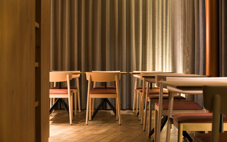 Da die vorhandenen statischen Säulen keiner Raumgliederung folgten, wurden sie durch das innenarchitektonische Konzept noch vermehrt und so optisch als Raumteiler genutzt. Wo sich eine kühle Glaswand zum benachbarten Geschäftslokal befindet, entstand durch hinzufügen eines Vorhangs ein ruhiger Sitzbereich. Der bestehende Eichenparkett-Boden wurde mit einem ins Farbkonzept passenden Teppich ergänzt, wo jetzt ein neuer Schwerpunkt mit gemütlichen Loungemöbeln entstand. Das Rückbuffet bei der Bar ist als Holzregal konzipiert und strahlt trotz der benötigten Infrastruktur Wohnlichkeit aus.
