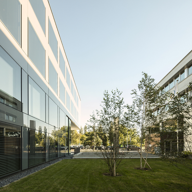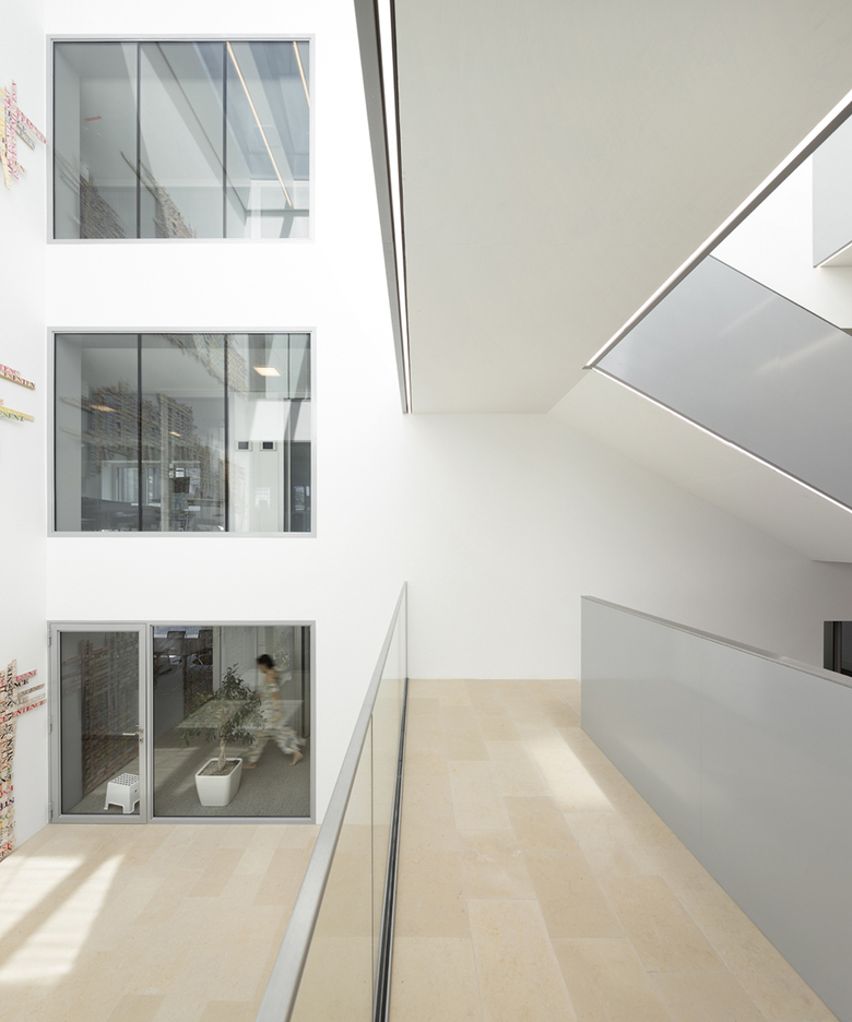 The building’s structural complexity remains particularly discreet, behind a facade totally covered with tinted glass enhanced with enamelled and opaque features. This glass facade gives the building its unique character and unity. Glass panes are fixed and ventilated. Double glazing, which is both thermal- and acoustic-insulating, has been installed on the inner faces. These windows open for ventilation purposes as well as for cleaning. Solar protections, indispensable for controlling natural daylight in the office spaces, are fitted in the spacing between the outer inner panes.