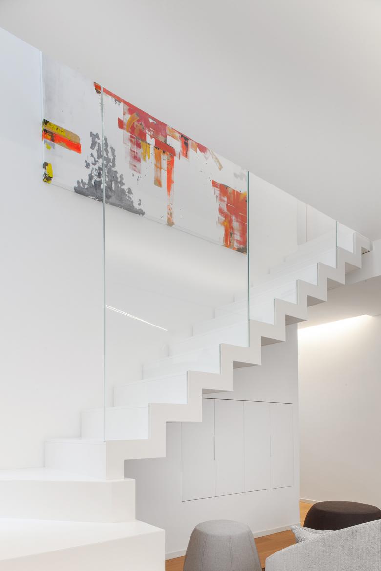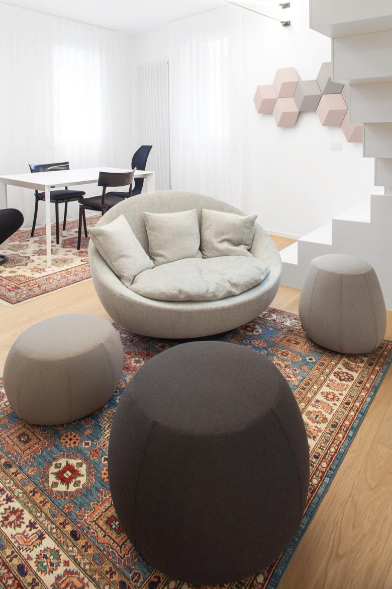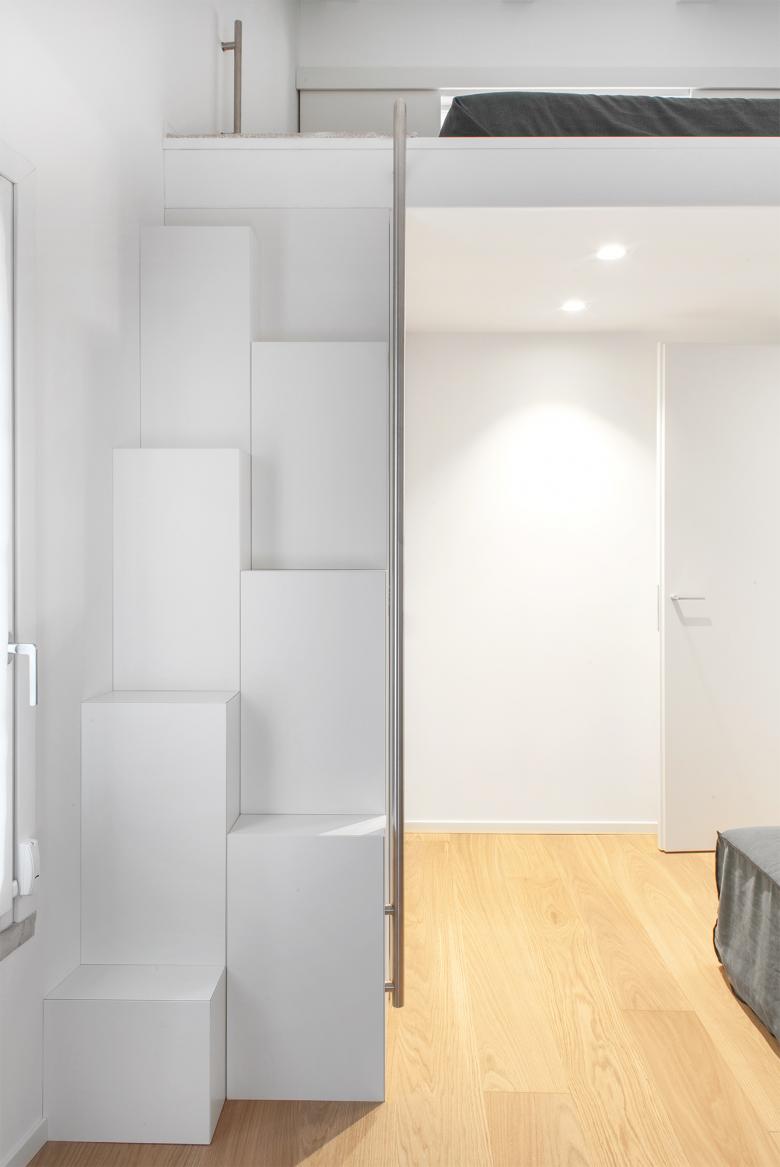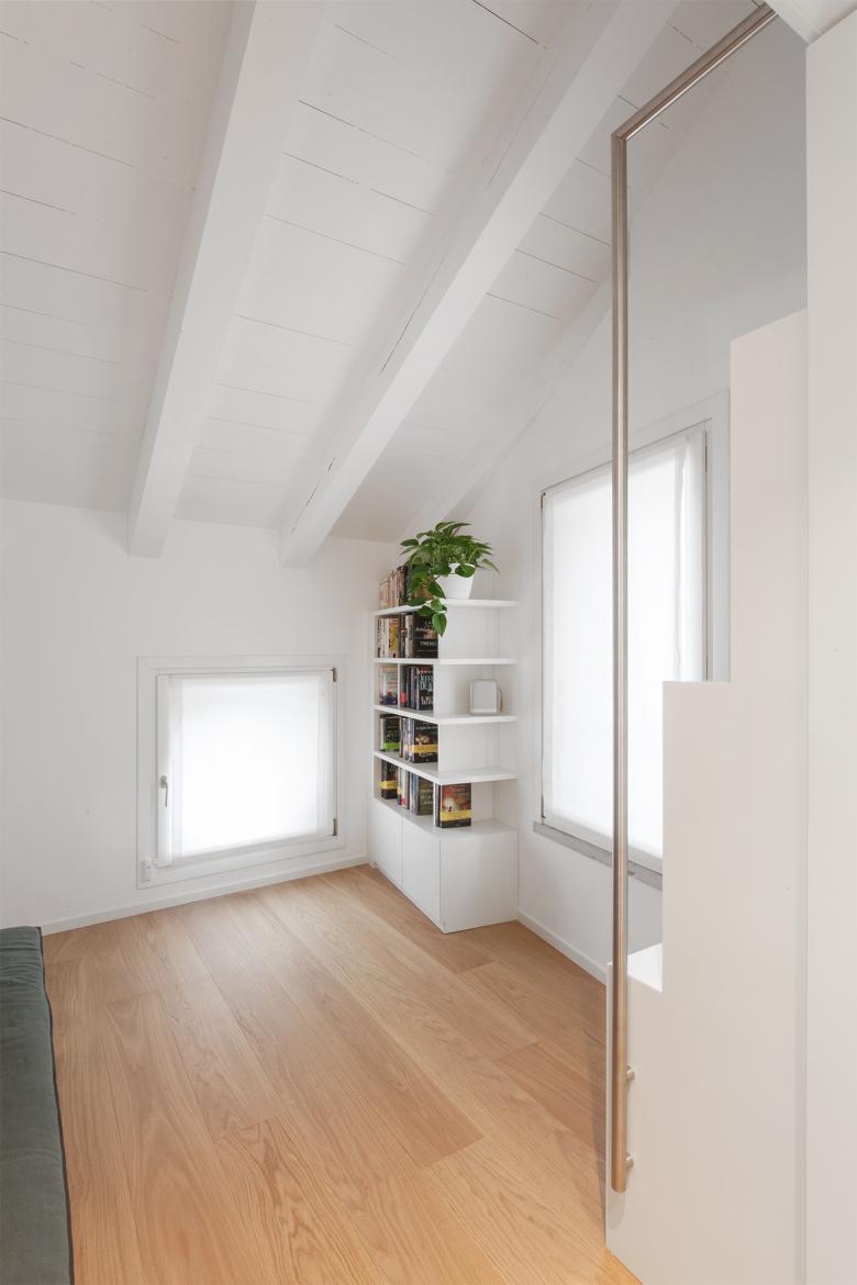 Il bianco è la componente dominante che avvolge lo spazio in questo progetto di ristrutturazione d’interni di un piccolo edificio nel cuore del centro storico di Oderzo.
