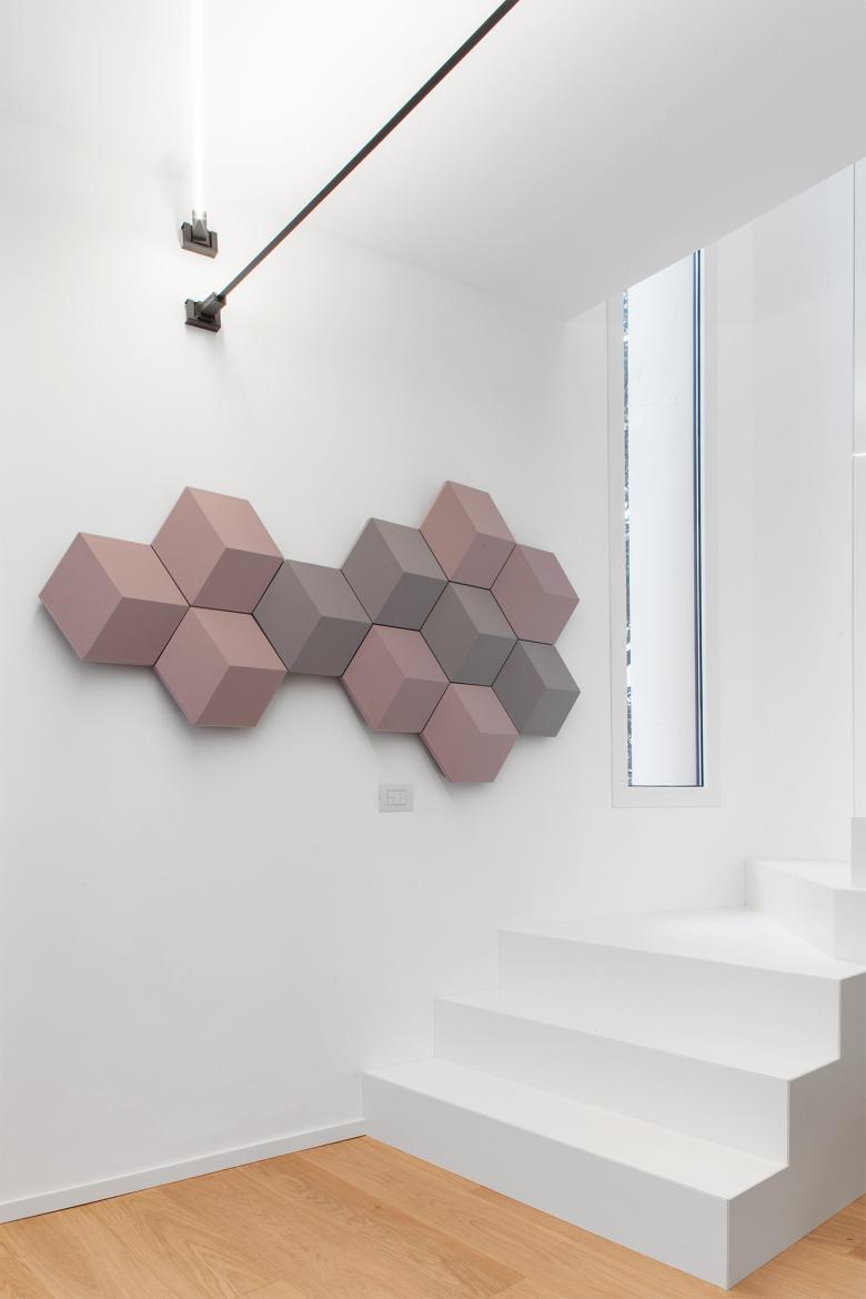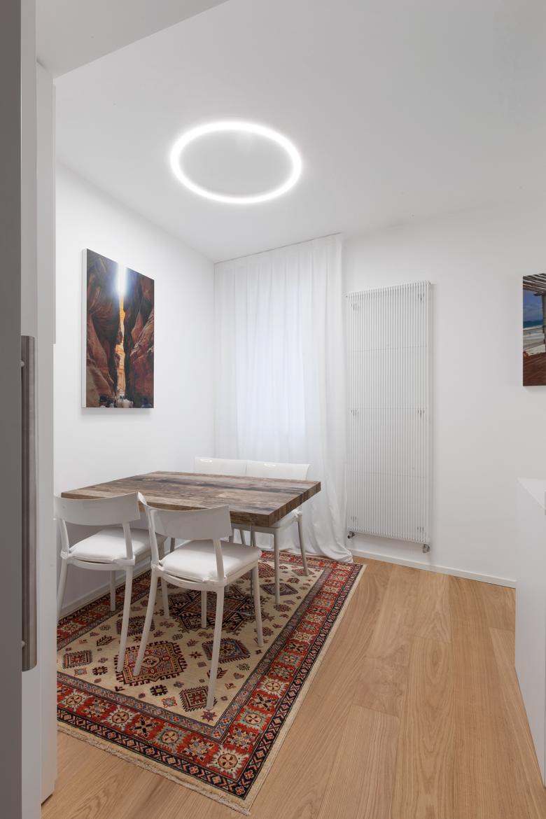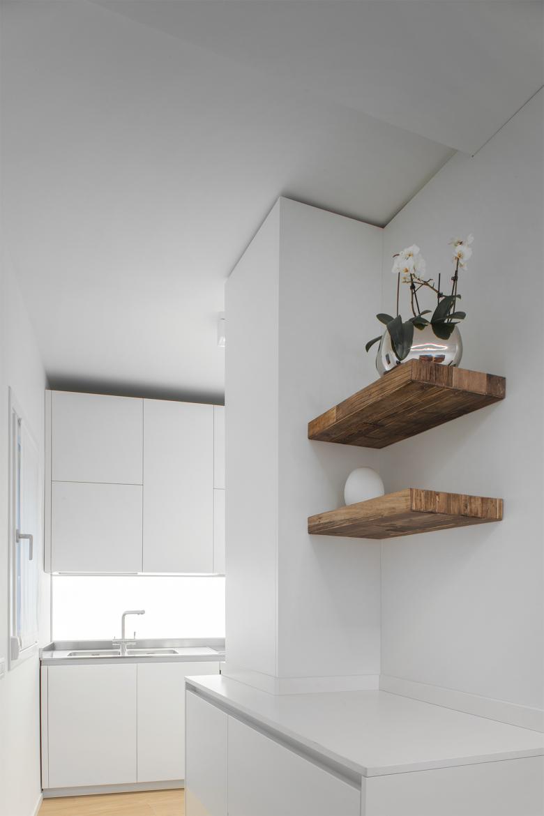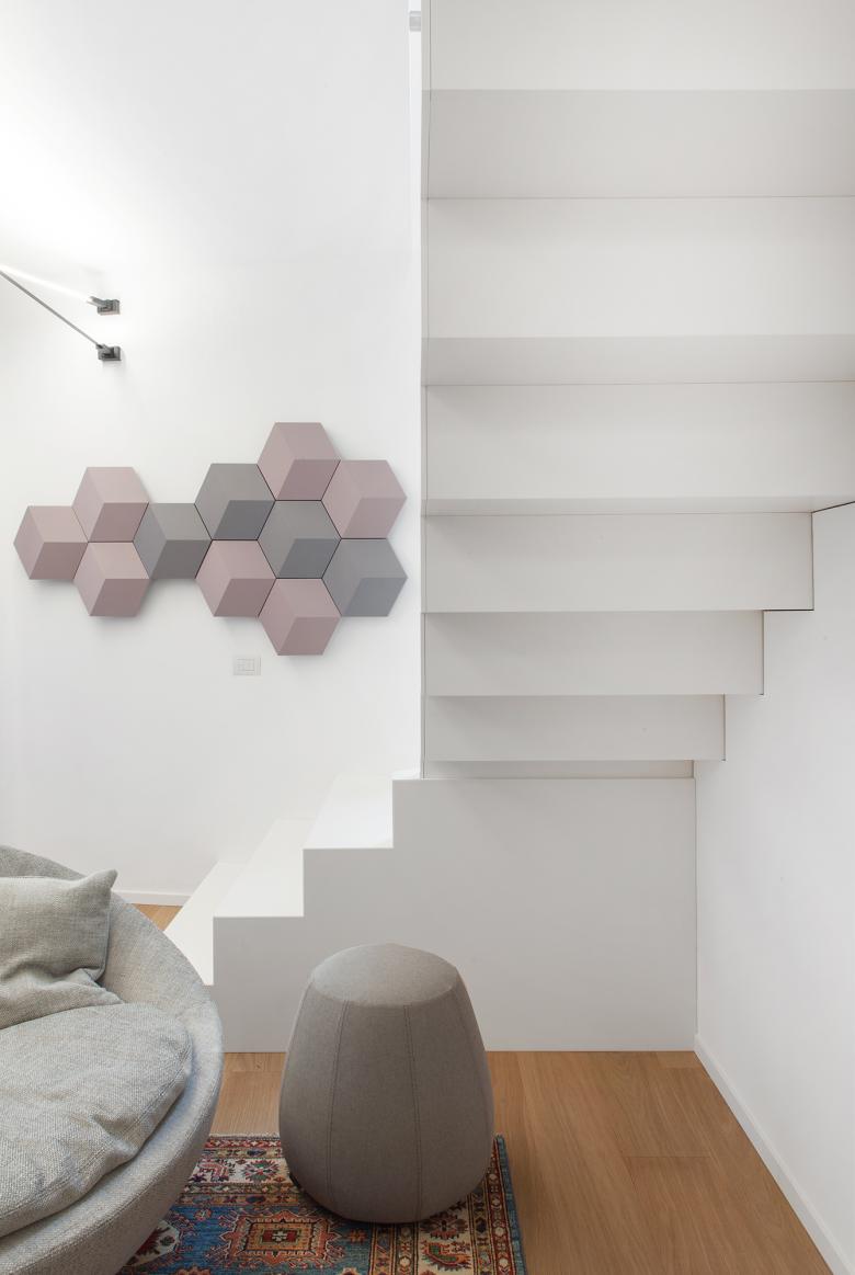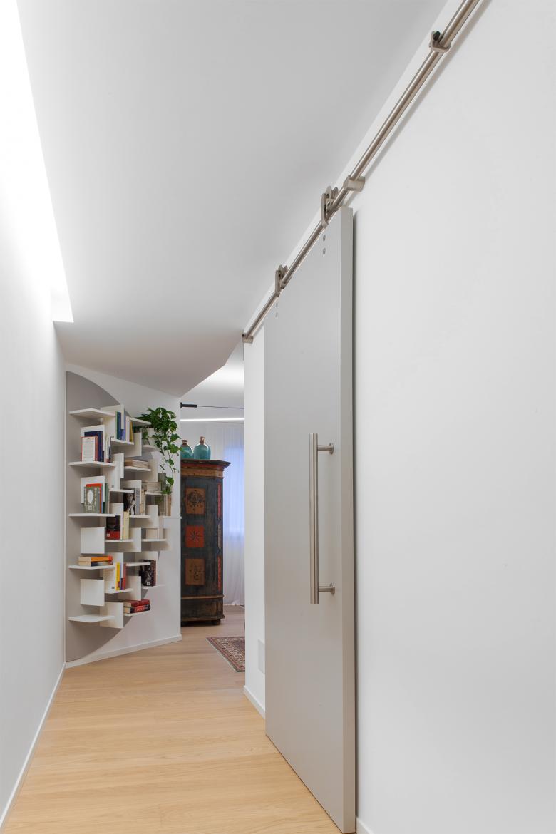 Attraverso piccole azioni, lo spazio irregolare e compresso, esito di un restauro che lo aveva fortemente conformato negli anni Novanta, è stato letto e reinterpretato come un percorso che si sussegue lungo tutti gli ambiti dell’appartamento – ingresso, cucina, soggiorno, camere – in modo che tutti gli spazi della casa diventino riconoscibili attraverso un unico gesto.