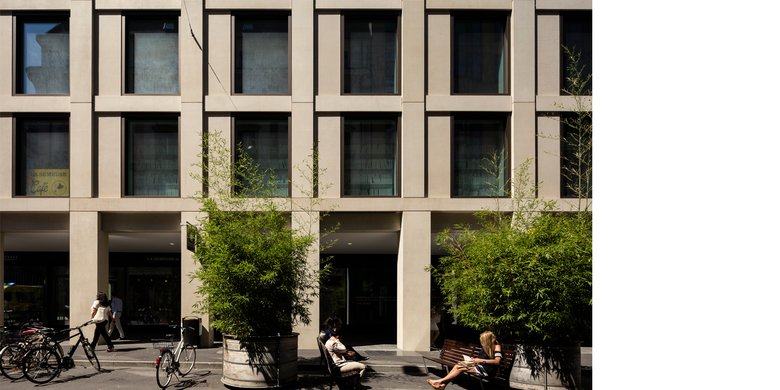 Dans un ensemble aux qualités techniques, architecturales, historiques et patrimoniales disparates, le projet offre un éventail complet de types et de niveaux d’intervention : un bâtiment est supprimé, un immeuble est démoli et reconstruit, dans le palais bancaire les façades sont maintenues alors que les dalles existantes, fragilisées par des interventions successives, sont reconstruites, deux bâtiments sont rénovés (changement des fenêtres, isolation des façades et rénovation intérieure), alors que pour le Passage des Lions, l’intervention cherche à préserver le maximum de substance de la construction initiale et à restaurer dans l’esprit d’origine les éléments remplacés.