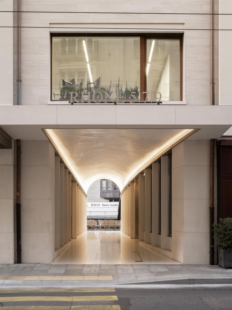 Conformément aux propositions du mandat d’études parallèles, le passage public en forme de baïonnette au No 7 est redessiné et mis en valeur dans son expression, sa géométrie, et sa fonctionnalité, tissant ainsi un lien étroit, fonctionnel et visuel, entre la rue du Rhône et le fleuve.