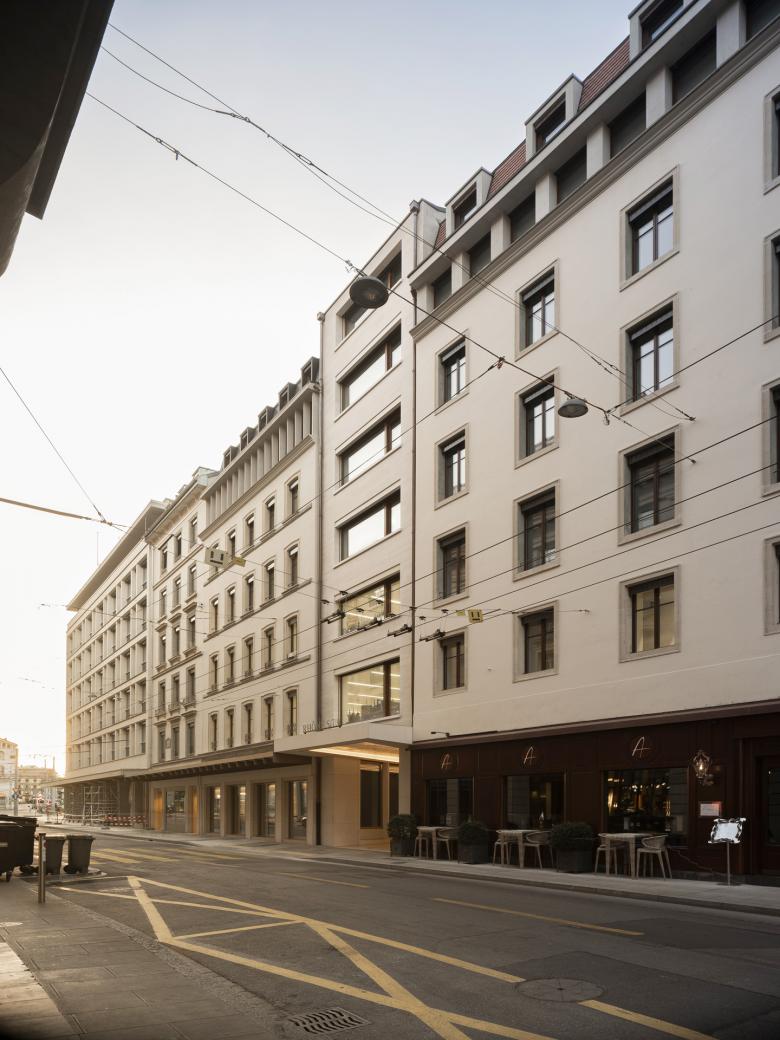 Le projet propose le remplacement des éléments d’enveloppe mis en pace en 1974 par J.V.Bertolli, à savoir la reconstruction des façades du dernier niveau qui assument une fonction de joint entre le corps principal du bâtiment et la toiture, le remplacement de la toiture, ainsi que le retour à une expression minérale, néanmoins contemporaine, de la façade Rhône 7. En outre, des renforcements structurels, ainsi que la mise aux normes de sécurité incendie et le renouvellement des installations techniques sont éxécutés.