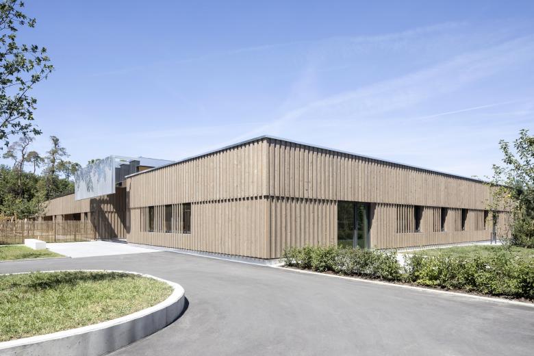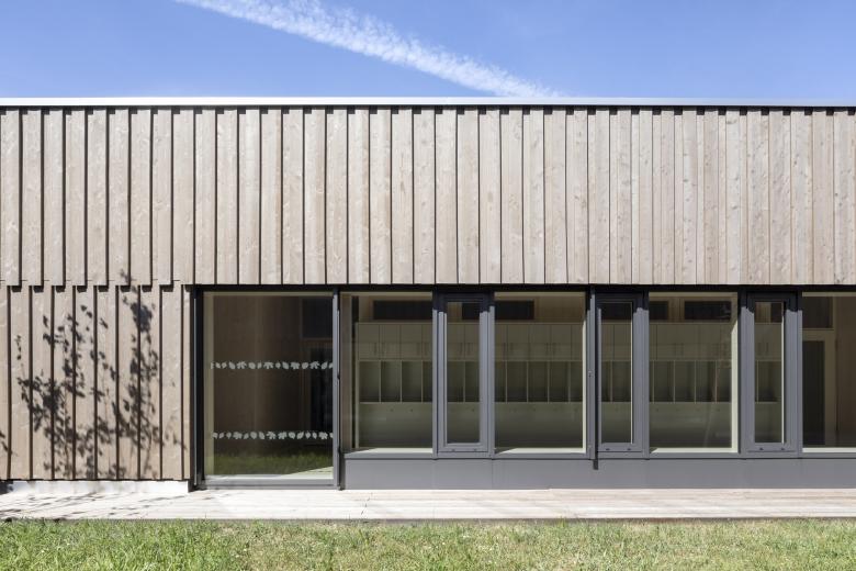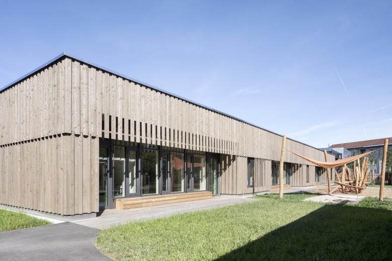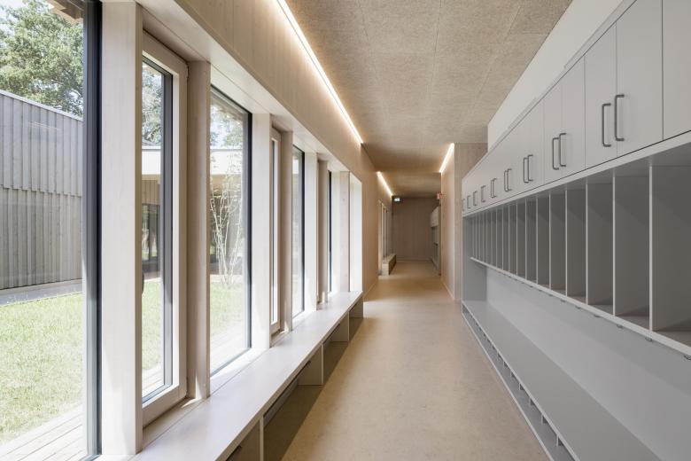 Der eingeschossige Baukörper fügt sich harmonisch in die offene Landschaft am Ortsrand von Walldorf ein. Die jeweils drei Kindergarten- und Kinderkrippengruppen sind in den beiden Flügeln untergebracht, die in der Mitte durch einen gemeinsamen Innenhof, der als Einschnitt ausgebildet ist, verbunden sind. Vom gemeinschaftlichen Foyerbereich, der in die Aula übergeht, können alle weiteren Funktionsbereiche erschlossen werden.