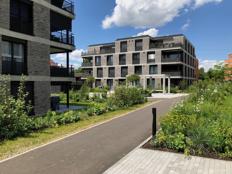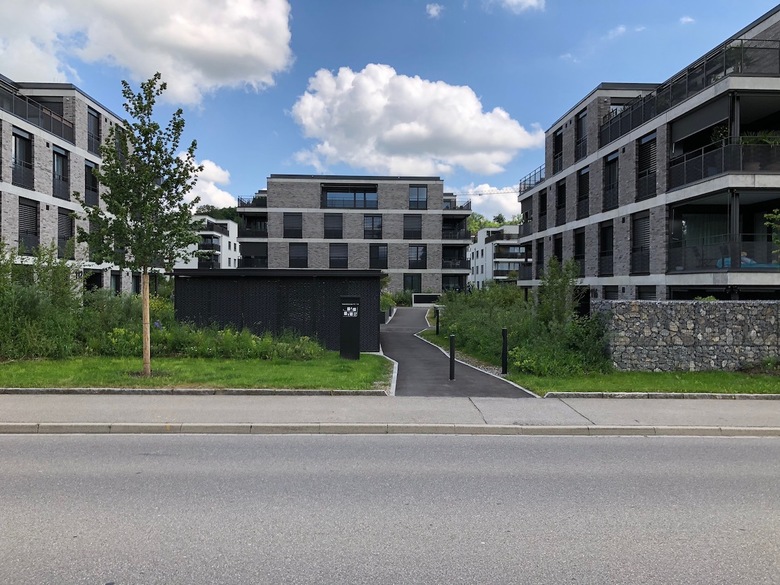Geplant sind vier viergeschossige Mehrfamilien- häuser mit 68 Mietwohnungen. Die Baukörper sind kompakt und die Grundrisses effizient ent- worfen, sodass diese nachhaltig und kostengünstig erstellt werden können. Die einfache Statik unterstützt dies. Das Wegnetz schliesst an die bestehenden Struk- turen an und gewährt mit Geländemodellierungen sowie Bepflanzungen die Privatsphäre der erdgeschossigen Wohnungen.