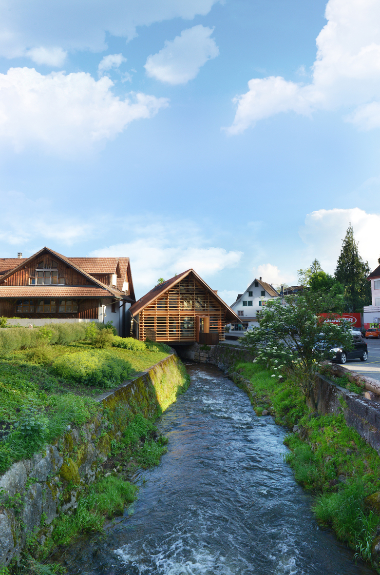 Die Säge, stand unmittelbar neben dem Bach auf dem Fundamentsockel. Der Holzbau mit liegendem Dachstuhl überspannt den Sägeraum und die Jonen in einem. Bei der Umnutzung zu Gewerberäumen war die Klärung der ursprünglichen Holzstruktur und die Öffnung der Fassade zentral.
