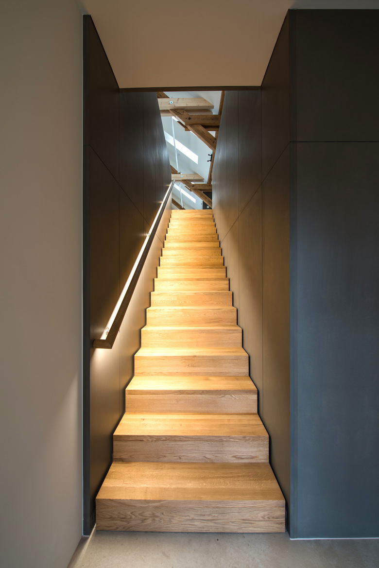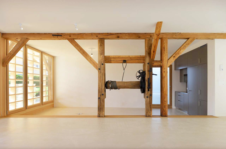 Der Dachstuhl konnte mit minimalen Eingriffen vom Brettlager zu einer Büronutzung weiterentwickelt werden. Die lange, lichtbringende Gaube erscheint dabei als klar zugefügtes, neuzeitliches Elemente.