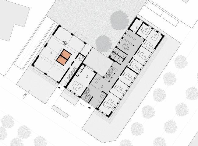 Die Lage ist reizvoll: in absoluter "Grünlage" am Rande der südlichen Innenstadt mit Flair und Kulturangebot. Die vorhandenen Bauten gaben sich relativ spröde und verschlossen. Außerdem schien die Struktur eines klassischen Bürogebäudes in der schmalbrüstigen Version der 50er Jahre wenig zukunftsfähig. Nicht nur aus baurechtlichen Überlegungen sondern auch unter dem Aspekt der Nachhaltigkeit schlugen wir deshalb im Wettbewerb einen Teilabriß und einen ergänzenden Neubau zu dem zu erhaltenden Eckgebäude vor. Während der Altbau auf dem Eckgrundstück auch künftig Sitz der Pensionskasse und des Arbeitgeberverbandes Deutscher Eisenbahnen bleibt, ist der Ergänzungsbau nutzungsoffen konzipiert, weil in solch gehobener innerstädtischen Lage erfahrungsgemäß die Zukunft einer Gebäudetypologie gehört, die beides zulässt: Wohnen und Arbeiten.