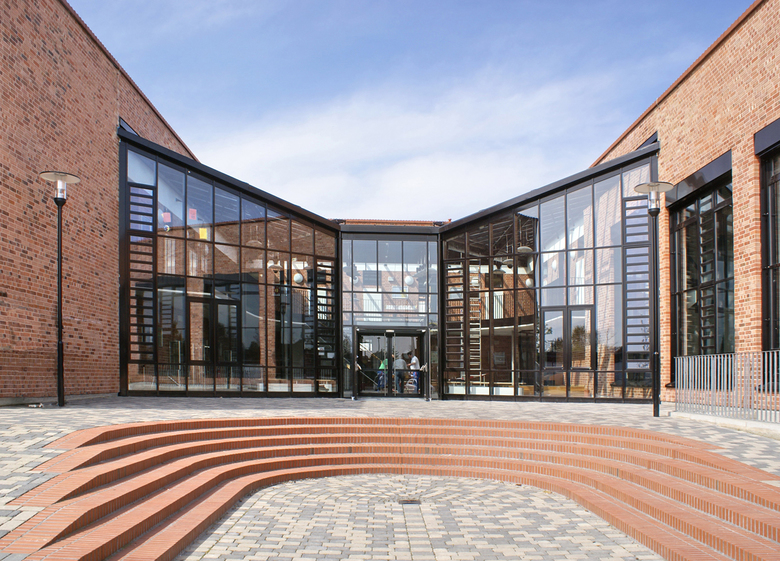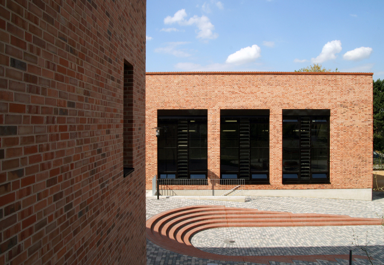 Die Realschule, ein bestehendes Gebäude aus den 60er Jahren, sollte um 5 Klassenräume, eine naturwissenschaftliche Raumgruppe und eine zentrale Halle als Forum und Lichthof erweitert werden. Die Erweiterung, die mit der Halle bis in die Gebäudemitte des Bestandes eingreift, erfolgte bei vollem Schulbetrieb. Der neue Lichthof gibt der Schule mit ihren bisher engen Verkehrsbereichen eine offene, helle Mitte und integriert den Erweiterungsbau in den Bestand. Die eigenständige Architektursprache des 2-geschossigen Neubaus mit geneigter Dachfläche korrespondiert über Material und Farbe mit dem Altbau und verbindet alt und neu zu einer Einheit. Die 2-zügige Grundschule mit integrierter Turnhalle wurde neu gebaut. Turnhalle und 2 Klassentrakte gruppieren sich als Baukörper mit geneigten Pultdächern um eine zentrale gläserne Eingangshalle, die für Schulveranstaltungen genutzt werden kann. Eingangshalle und Schulhof erlauben als räumliche Einheit Festveranstaltungen außen und innen. Ein nachträglich geforderter neuer Ganztag wurde - wegen des beengten Grundstücks - im Untergeschoss mit davor liegender großzügiger Abgrabung realisiert. Beide Schulgebäude wurden mit gleichen Materialien errichtet, roter Ziegel als Vorsatzschale und rote Dachflächen mit Betondachziegeln (Braas novo - Frankfurter Pfanne – ziegelrot), dunkle Metallfenster und verzinkte Laubengänge als Fluchtwege. Die Freiflächen mit Schulgärten und Bäumen integrieren das Gebäudeensemble zu einem Schulcampus.