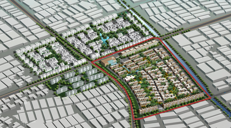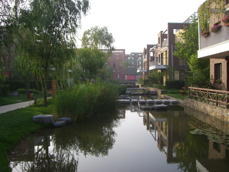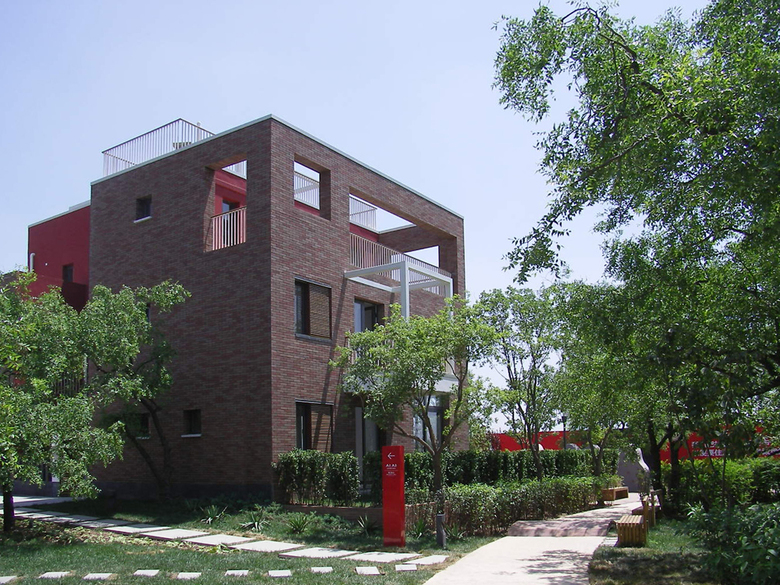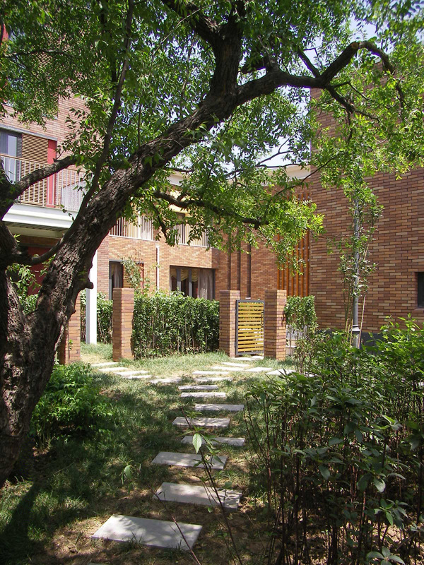 Abweichend von der in China gängigen Praxis der Verdichtung durch eine hohe Geschossigkeit, stützt sich unser Konzept auf eine Gebäudetypologie, welche die chinesiche Tradition des Hofhauses aufgreift. Neben diesen zweigeschossigen Hofhäusern gibt es auch dreigeschossige Reihenhäuser, gestapelte Einfamilienhäuser und Villen, alle mit privatem Außenbereich als Garten oder Dachterrasse. Der Backstein als Fassadenmaterial und eine durchgängige Architektursprache betonen den Zusammenhang innerhalb der Wohnsiedlung, wogegen eine unterschiedliche Farbgebung der Putzflächen die Individualität der einzelnen Quartiere unterstreicht. Der 2- und 3-geschossige Kernbereich wird im Randbereich durch 4- oder 5-geschossige Bebauung, einen 6-zügigen Kindergarten und ein Clubgebäude mit Sport- und Freizeiteinrichtungen ergänzt. Die durchschnittliche GFZ liegt im ersten Bauabschnitt bei 0.8. Die Wohnungsgrößen reichen von 85m² Appartements bis 350m² Villen.