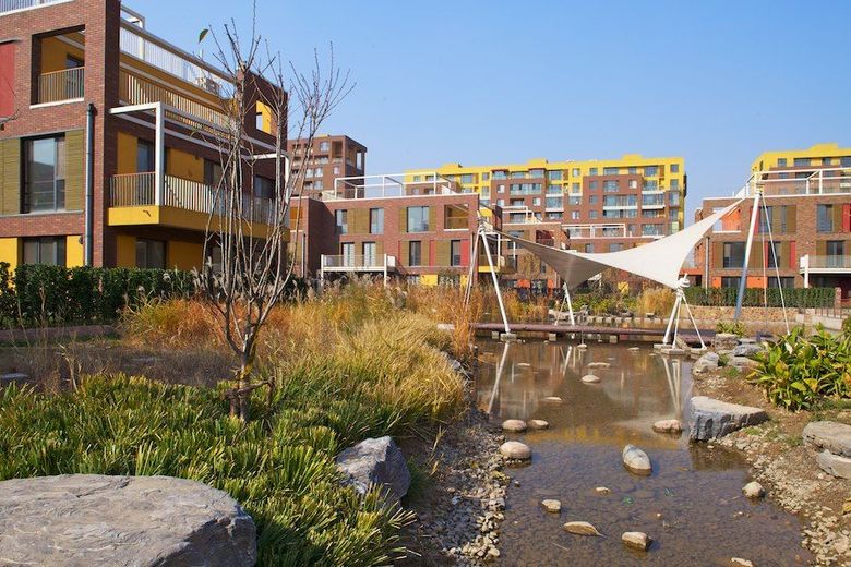 Der zweite Abschnitt steht in Kontinuität zum vorhergegangenen Abschnitt des Society Hill Projektes. Das städtebauliche Konzept und die bestehenden Typologien wurden überarbeitet und durch neue Typologien ergänzt. Im Süden nehmen 5-geschossige Apartmenthäuser die Maßstäblichkeit des ersten Abschnittes auf der gegenüberliegenden Straßenseite auf, während im Norden, zum innerstädtischen Grünzug hin, 10- und 12-geschossige Apartmenthäuser den Abschluss bilden. Als neuer Baustein neben den schon etablierten Typologien der Clusterstruktur im Innern entstehen großzügige Doppelhäuser. Backstein und Putz bleiben die charakteristischen Materialien, die hellere Farbgebung der Gebäude entlang der Nordgrenze unterstreicht deren gesonderte städtebauliche Bedeutung. Die mittlere Dichte von 1,0 liegt um 0,2 über der des ersten Bauabschnittes.