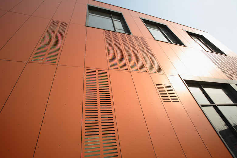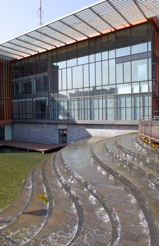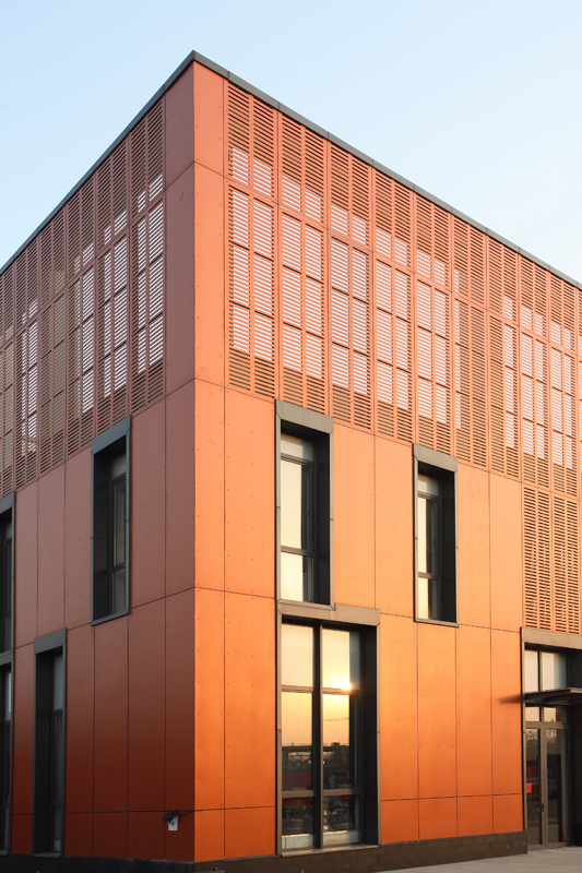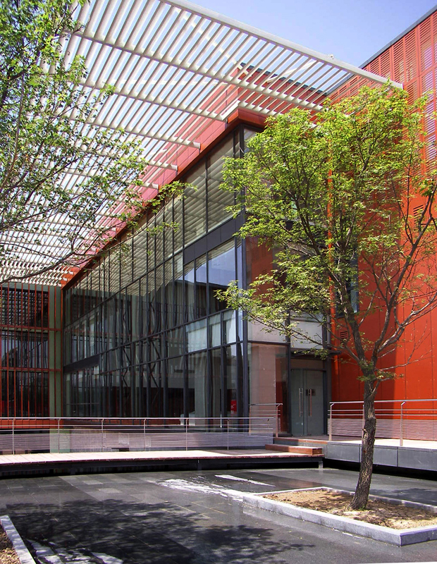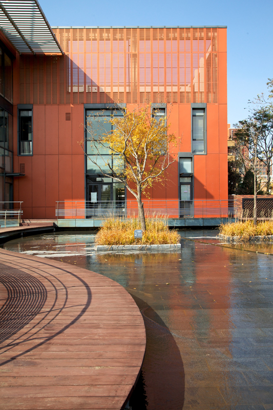 Im Herzen der Siedlung liegt am Haupteingang des ersten Bauabschnittes das Clubgebäude der "Society Hill" Residence. Die kubische Architektur des Gebäudes gibt sich auf den Straßenseiten geschlossen, nach Innen öffnet sich das Gebäude in voller Höhe und gibt den Ausblick auf die Plaza mit der Wasserkaskade und den dahinter beginnenden "Orchard Park" frei. Das multifunktionale Gebäude beherbergt eine Vielzahl von Sportangeboten: Schwimmhalle und Sporthalle sind gestapelt; Fitness und Aerobic; auf dem Dach ein außen liegender Tennisplatz. Neben diesem Schwerpunkt, beinhaltet das Raumprogramm auch ein Foyer für Veranstaltungen und Ausstellungen, eine Lounch, die Verwaltung der Siedlung sowie zahlreiche technische Einrichtungen. Die Fassade aus dunkelroten, teilweise perforierten Trespa-Platten legt sich gleichmäßig über alle Funktionsbereiche, erlaubt direkte oder gefilterte Ausblicke.