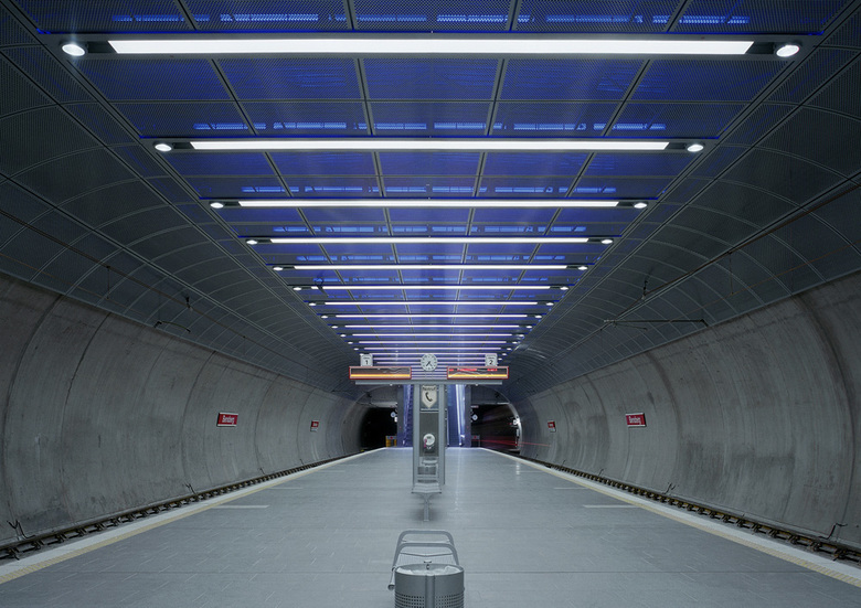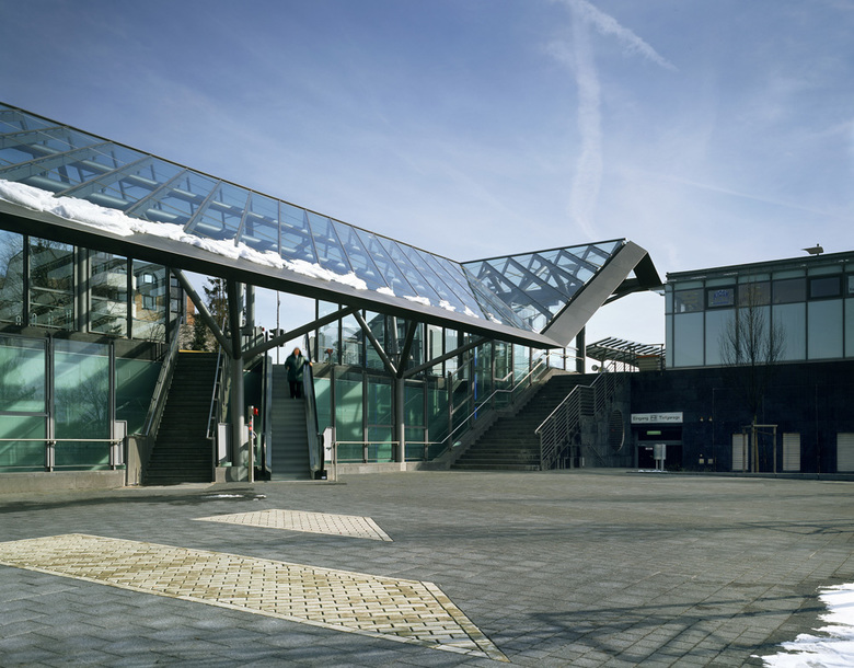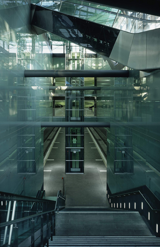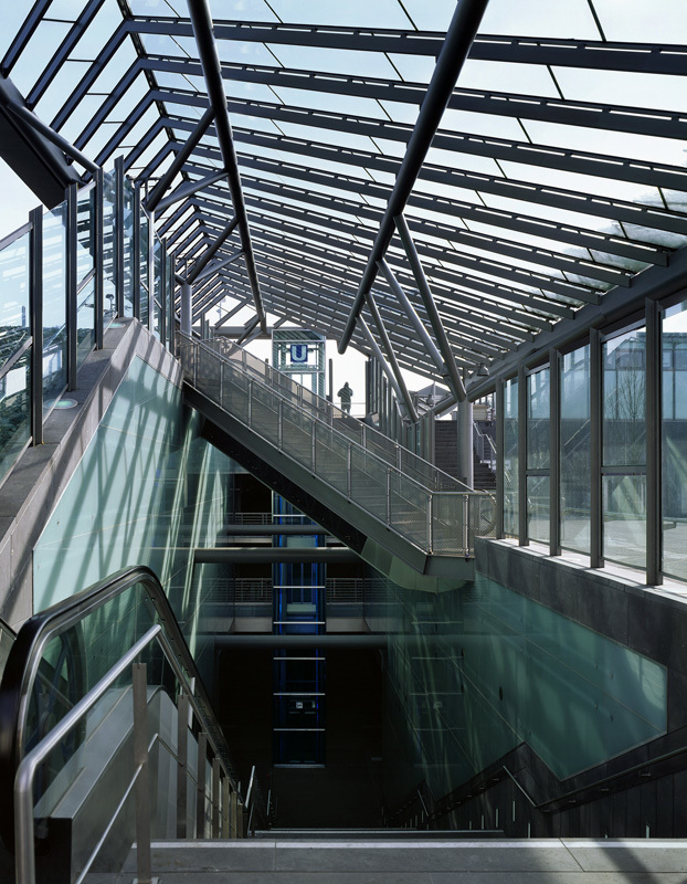Dort, wo der Haltestellenraum über Treppen, Rolltreppen und Aufzug mit den Straßenebenen verbunden ist, fällt über einen durchgehenden offenen Einschnitt Tageslicht unmittelbar in die Haltestelle. Der Fahrgast sieht von der Bahnsteigebene ins Freie und erfährt den Aufstieg von der Haltestelle aus 14 m Tiefe zur Erdoberfläche im Wechsel von gleichmäßigem Kunstlicht zur ungefilterten Helle des natürlichen Lichts.