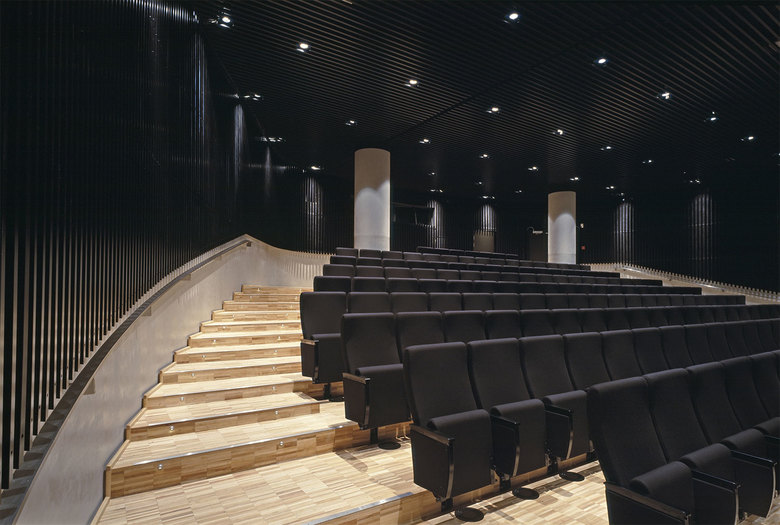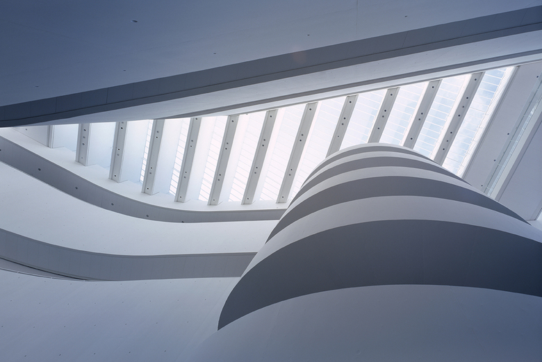 The building, set into the sloping site, has a footprint of 52 x 52 metres and stands almost 50 metres high. In contrast to the apparent severity of the exterior, the dazzling white interior, flooded with daylight, presents a sequence of highly organic sweeping curves that define the different levels of the building.