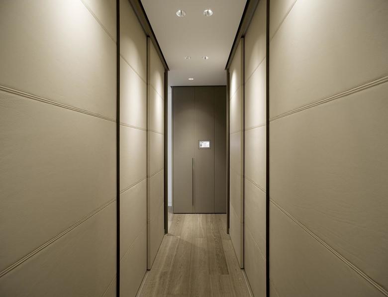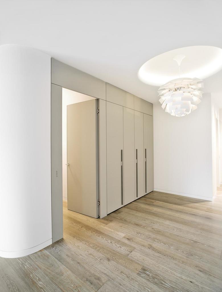 Eine Vielzahl baulicher Detaillösungen ist individuell für dieses Projekt angefertigt. So sind zum Beispiel die beleuchtete Arbeitsnische und die Edelstahlfronten der Elektrogeräte zusätzliche mit Edelstahlwangen eingefasst, deren Oberfläche identisch ist mit der der Elektrogeräte. Das Ausgussbecken und die Arbeitsplatte der Kochinsel sind aus dem gleichen Stein gefertigt. Anders als die Platte ist das Becken jedoch aus einem massiven Block herausgefräst. Und überall dort, wo Lichtschalter nicht auf fein gespachtelten Wänden sitzen, sind sie als dezente Klingelknöpfe in Möbeln und Wandbekleidungen integriert.