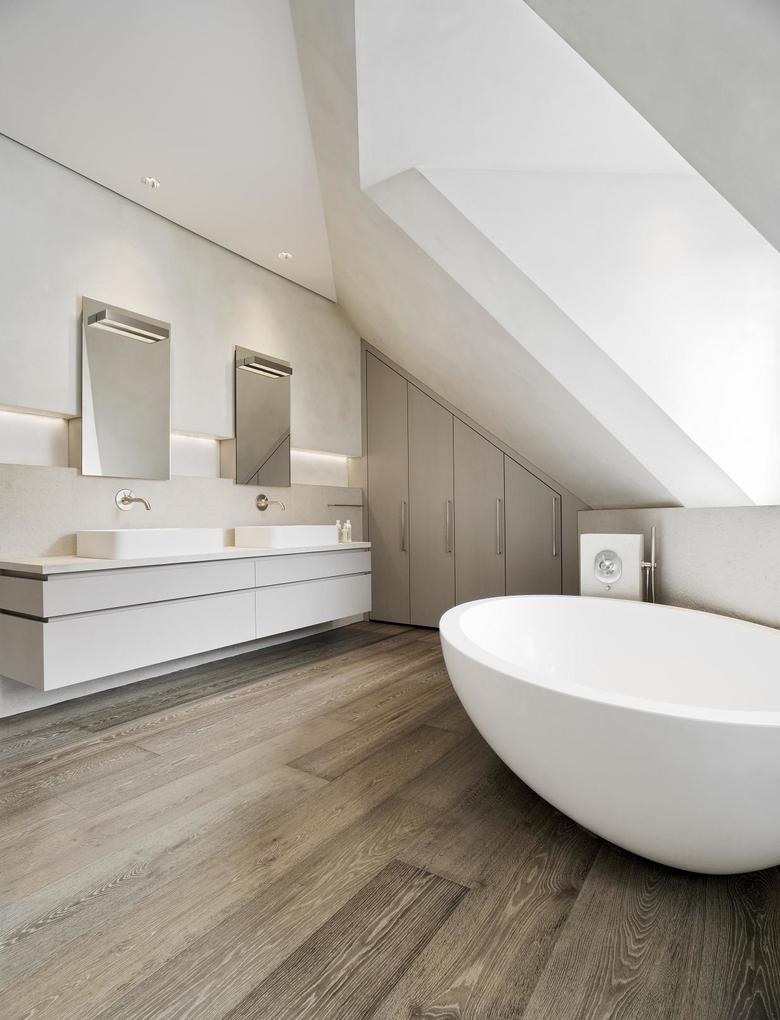 Der Farbton des Eichendielenbodens, das erdig-graue „Taupe“, zieht sich durch die gesamte Wohnung. Helle Eierschaltöne und tiefes Goldbraun massiver Bronze ergänzen die Farbpalette. Vereinzelt stechen elegant gemaserte Edelholzmöbel aus dem Kanon heraus.