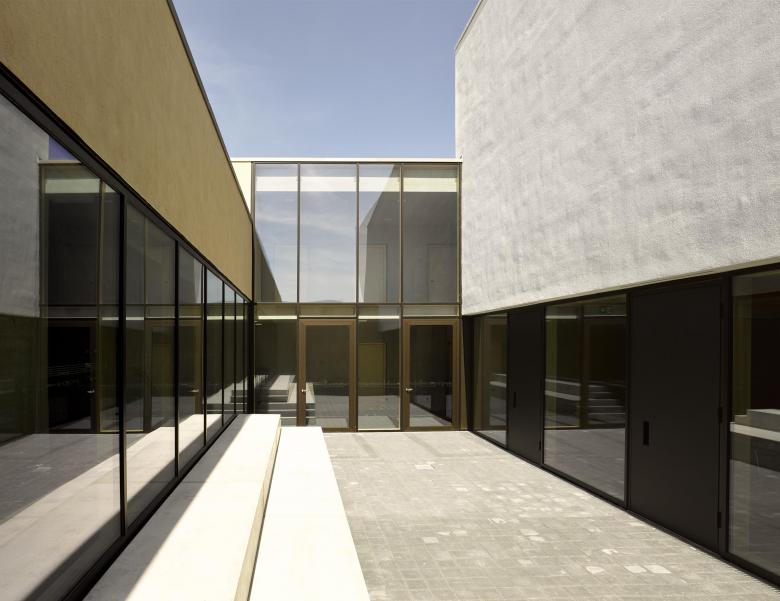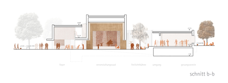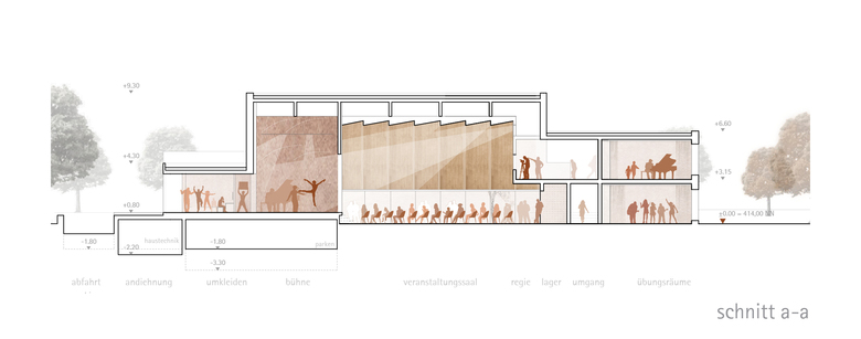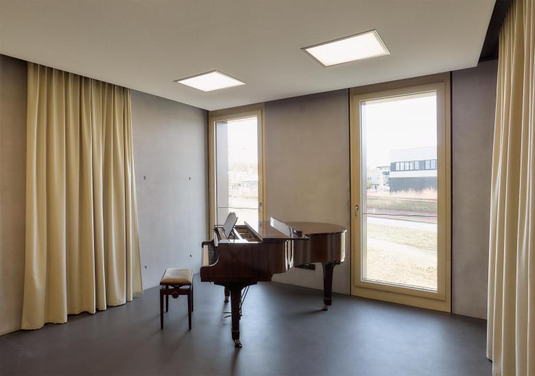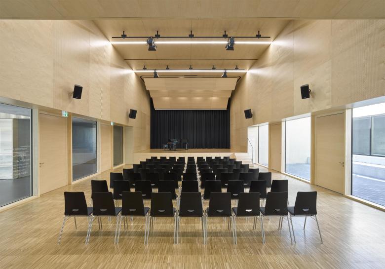 Im Vordergrund steht der architektonische Raum mit hochwertigen Oberflächen und einer dezidierten Lichtführung. Wie die Auskleidung einer Schatulle sind Foyer und Saal mit akustisch wirksamen Wandbekleidungen ausgeschlagen. Die Intimität dieser Räume wird durch die Beschränkung der verglasten Flächen auf das Erdgeschoss verstärkt. Gleichzeitig ermöglichen diese vielfältige Blickbeziehungen mit dem Außenraum und den Erschließungszonen.