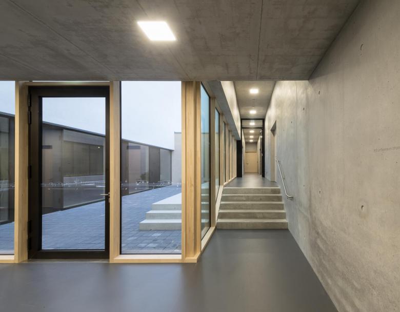 Die Anordnung der Raumeinheiten folgt unter Ausnutzung der natürlichen Topografie einem Raumplan auf drei Ebenen, der sich über die unterschiedlichen Raumhöhen außen abbildet und damit eine Einheit zwischen Gestaltung und Funktion, innen und außen entstehen lässt. Die ringförmige Erschließung auf der Eingangsebene verstärkt diese Wirkung.