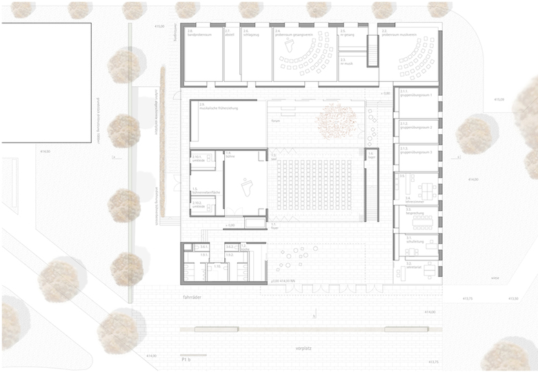 Die Gemeinde Pliezhausen mit 9.000 Einwohnern zeichnet sich durch das Engagement in der musikalischen Bildung von über 500 Akteuren aus. Um dem hohen Anspruch in Zukunft gerecht werden zu können, hat die Gemeinde in einen Neubau investiert. Die Lage am Ortsrand wurde als Chance genutzt, einen Solitär zu planen, der sich zwar mit seinem Haupteingang zur Ortsmitte orientiert, aber in der Schnittstelle zu einem Neubaugebiet auch als Drehscheibe funktioniert. Ein Vorplatz dient als Entree. Hier entsteht öffentlicher Raum. Die Musikschule wird architektonischer und kultureller Mittelpunkt.